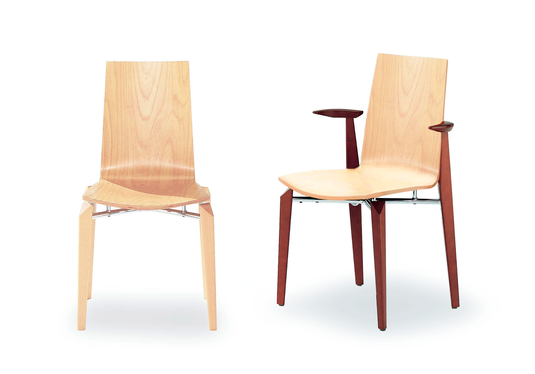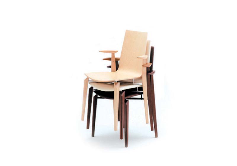 シェルの座はスリムな形状になっており、スタッキング機能も持たせていて、重ねての保管や移動にも便利になっています。アームの無いサイドチェアと短いアームの付いたアームチェアがあり、短いアームはテーブルからの出入りに便利で、杖のように立ち上がりに利用することができ、接合部にスチールロッドを埋め込む事で十分な強度を出しています。