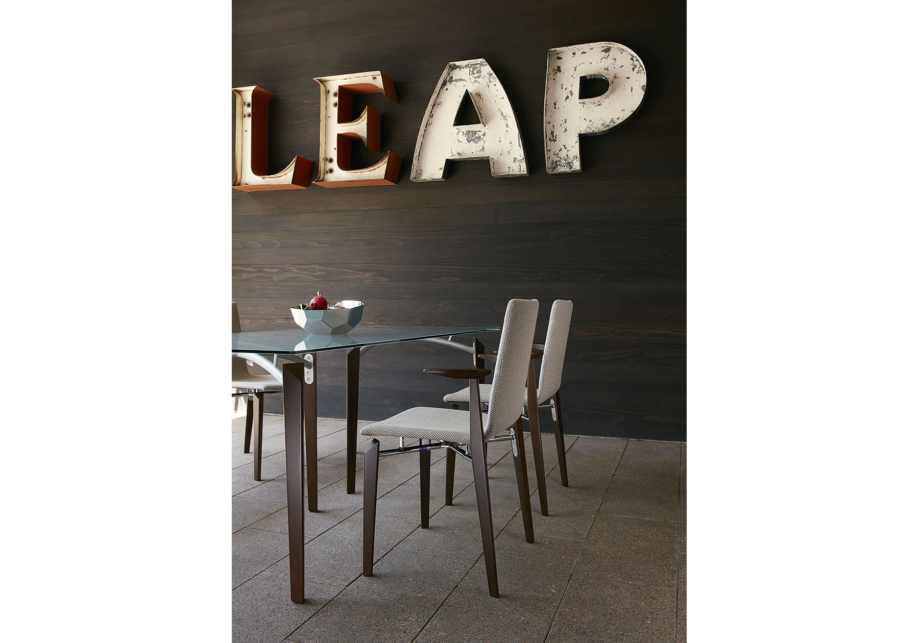 座は、ビーチ材の単板でプレスされた3次元成合板が座と腰を支えます。バリエーションはファブリックで表情が変えられるウレタンクッション材が入ったAタイプとビーチ材を塗装仕上げしたカジュアルなCタイプの2種類から選ぶことができ、脚部はチェルボシリーズの特徴でもあるビーチ材の脚部と、それを支えるスチール製のXフレームにプレートパーツで装着されていて、破損時の脚部交換などメンテナンス性にも優れています。スチールパイプは通常の構造用スチールパイプでなく、1.6ミリの特別な肉厚パイプが使われています。金属フレームは黒塗装とクロームメッキの2種類からお選びいただけます。