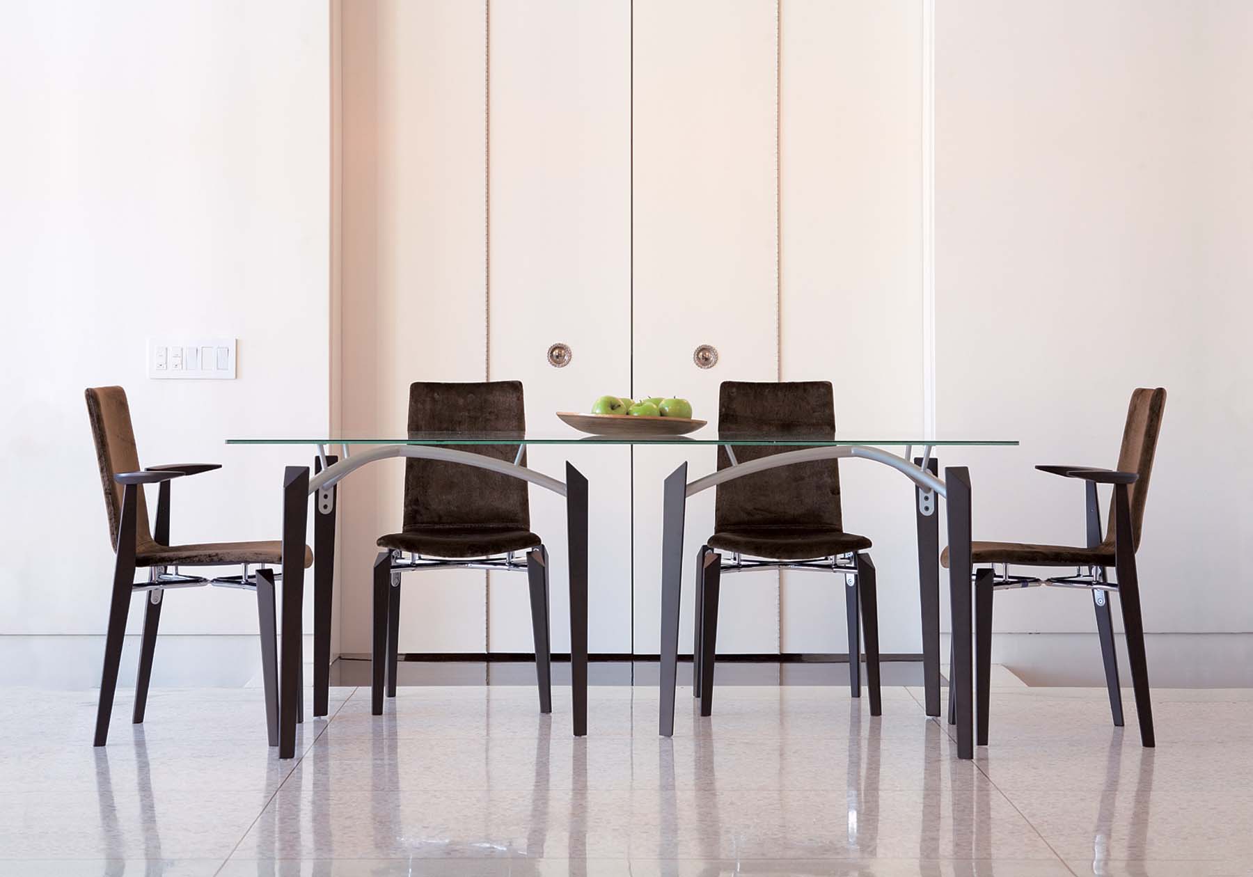 1986年に生まれたチェルボシリーズは草原に立つ若鹿のように躍動的なたたずまいで「鹿脚」と名づけられたスレンダーな脚とスチールフレームが特徴の椅子です。1996年にチェルボのアップグレードとしてチェルボ・デュエが生まれました。「鹿脚」の脚線美はそのままに、ミドルバックの背がフォーマルな印象を与え、3次元で成型された座が身体に自然にフィットし、腰を下ろし背をあずけた瞬間、心地よさに包まれる椅子で、発売以来20年近く経つベストセラーです。