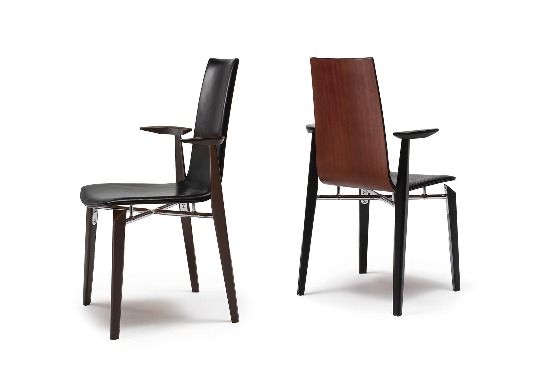チェルボシリーズの特徴は、このXフレームでフレームの先端にビーチ材の脚、座を浮かせるようにシェルが付けられています。パーツ化された構造はメンテナンス性に優れています。サイドチェアとアームチェアがあり、アームはテーブルに出入りしやすいように、短く作られています。アームはステッキをイメージし、人の体重がかかっても強度が保てるように、脚とアームの中にスチールの芯棒が入っています。サイドチェアもアームチェアもスタッキングが可能です。