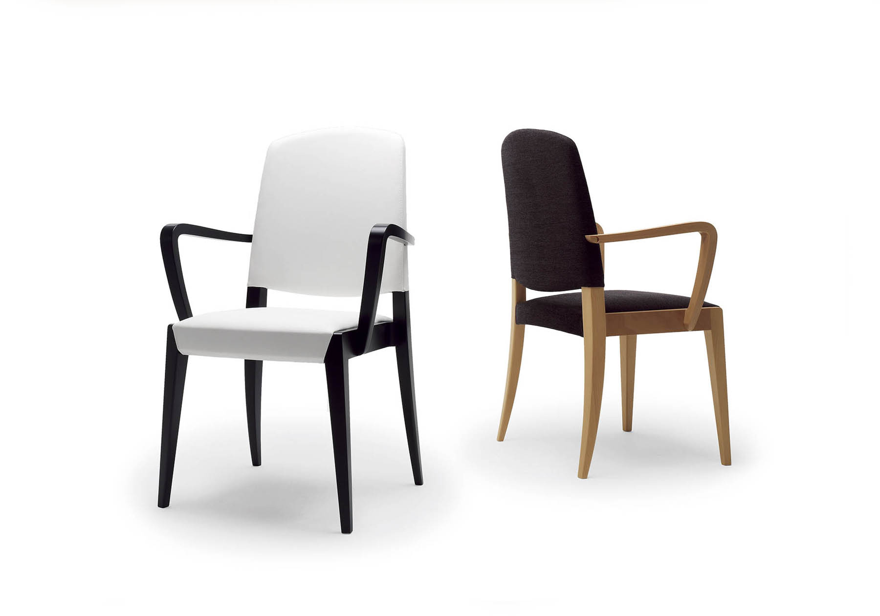 曲線と曲面を駆使したビーチのフレームを持つデザインで、滑らかな曲線を持つアームチェアもスタッキングの機能があります。背にはジャケットハンガーの役割を持った木製ハンドルとアルミハンドルの2タイプを用意しました。最大の特徴はスタッキングさせる為に後ろ足をインサートするためにえぐられたサイドフレームで、強度とデザインを両立した3次元成型合板を使用し、高い強度を出しました。そのサイドフレームが接合する後ろ脚は、太さを感じさせないように上から足先までダイヤモンド形状になっていて、シャープさを損なっていません。サイドフレームの緩やかなカーブは座の前部を広くし、布バネのファニチャーメッシュを使用したことで長時間の使用にもしっかり応えるゆとりのある快適な座り心地にしています。アームチェアのアームは高い強度の成型合板で作られています。そのアームチェアもスタッキング機能はあり、座とサイドフレームの間に後脚を入れながらスタッキングする事が可能です。