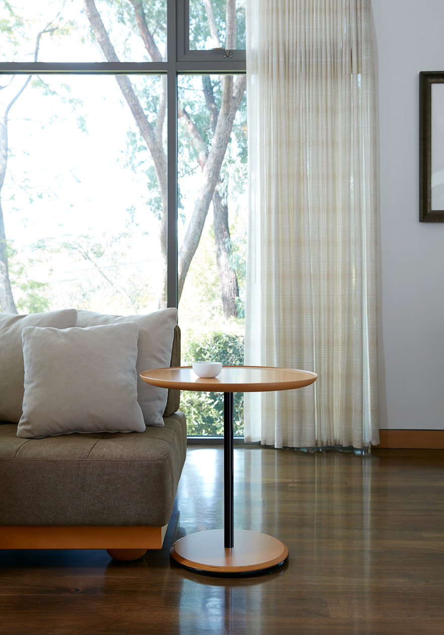 睡蓮をイメージした、シンプルな一本脚のサイドテーブルです。最小限の支柱と柔らかなウッドに被われた薄いスチールベースは、空間の中に天板を浮かせます。