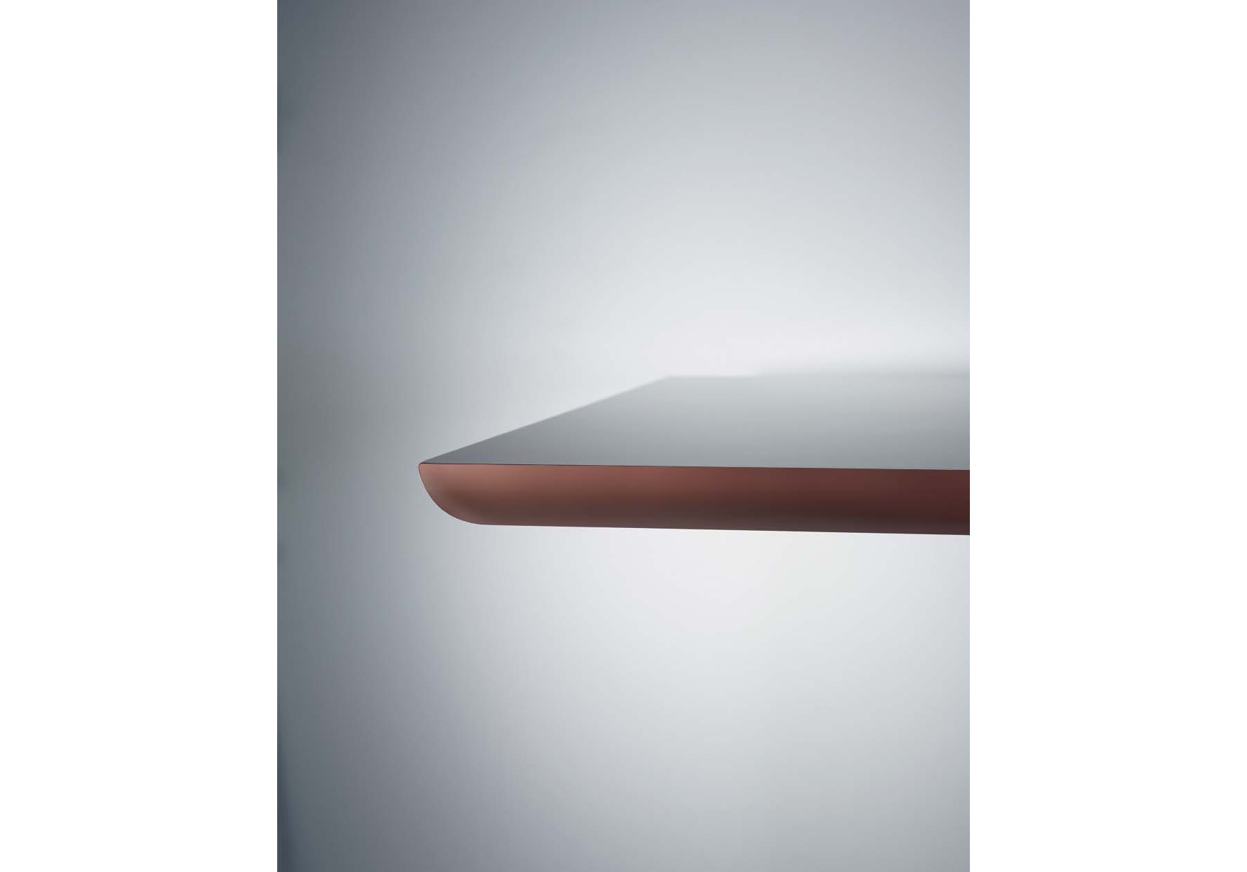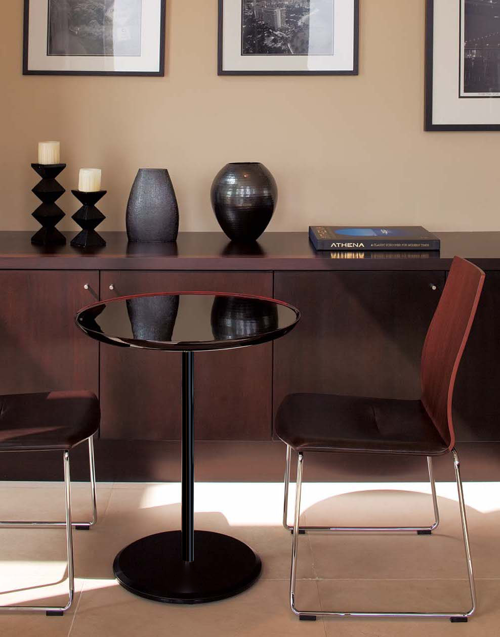 柔らかなエッジ持つ漆とMDFのテーブル、フラットなビーチ材の3種類からお選びいただけます。H700タイプはダイニングカフェテーブル、ロータイプのH600はソファテーブルとしてお使いいただけます。スチールパイプ部分のカラーは黒鏡面をご用意しています。