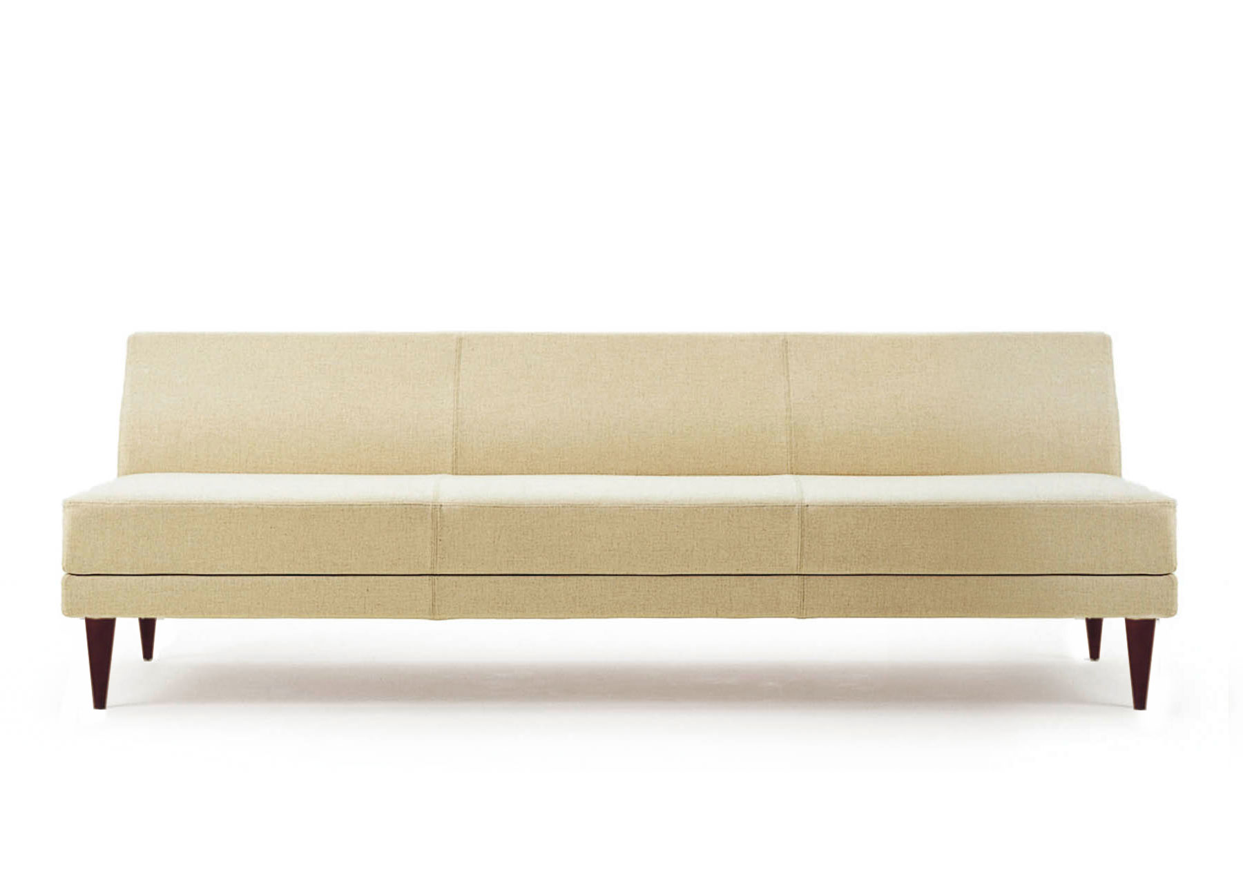 座クッションと背クッション部は座フレームと背パネルの中に置かれていて、固定用の樹脂パーツによって落とし込まれています。座のクッションは座面の合板下地の上にポケットコイルを全面に用いた上質な座り心地です。背はしっかりとした木フレームにウレタンフォームが張られていて、空間の視覚を邪魔しないでゆったりおくつろぎいただけます。