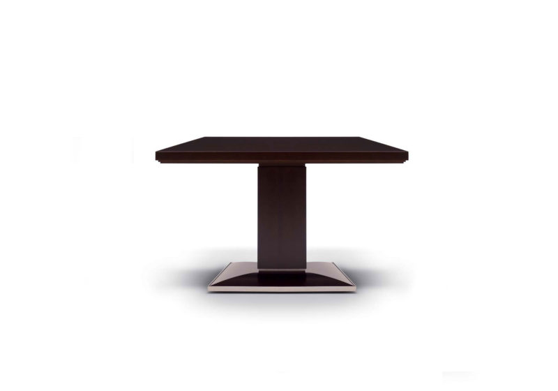 天板を受ける部分には、木製のテーパー加工された受けとベースと支柱の間にも、ステンレスパーツを入れ見えない箇所までのこだわりとアール・デコデザインイメージを取り入れています。フォーマルな場所でのダイニングシーンやフォーマルなビジネスシーンでも長くお使いいただけるテーブルです。