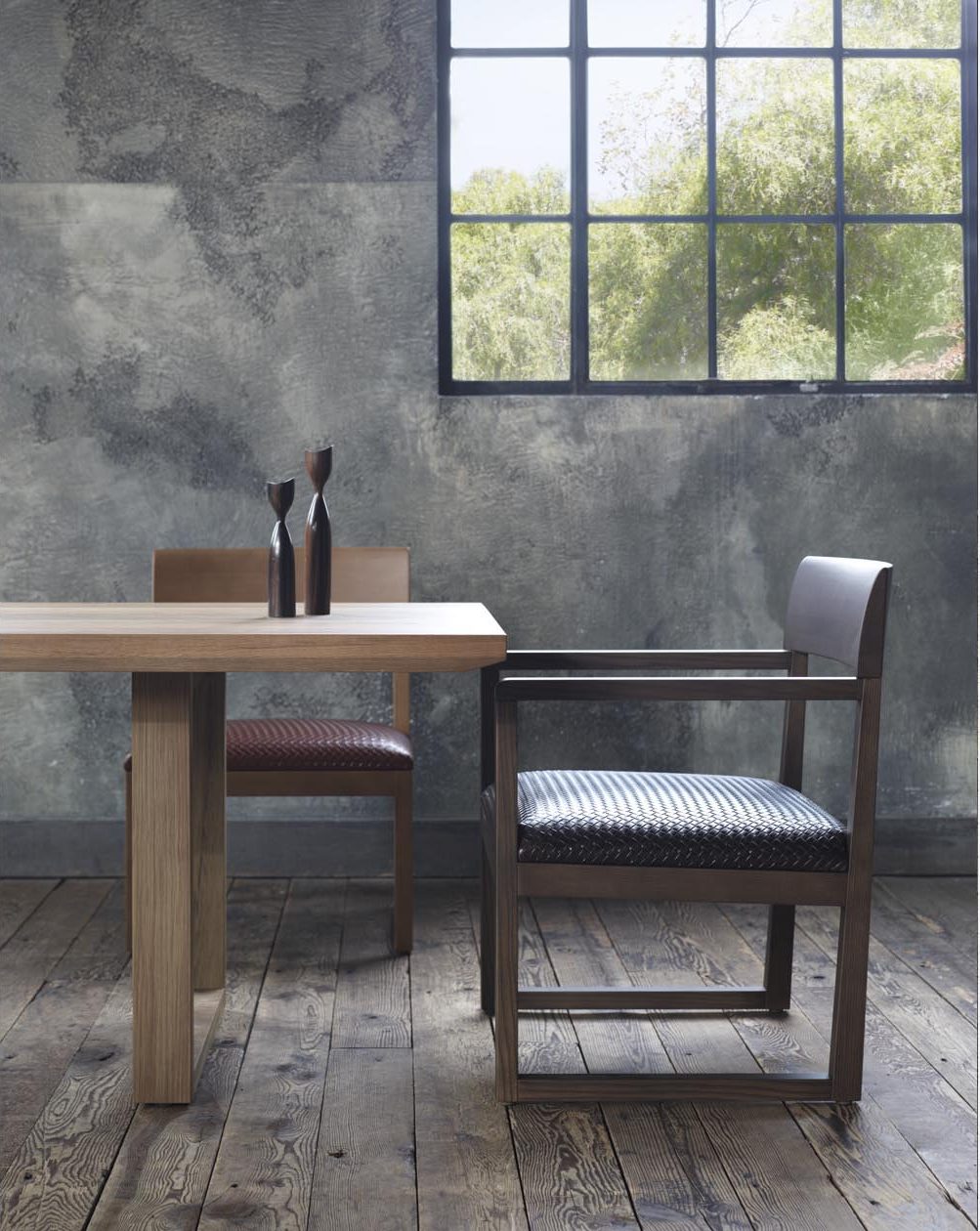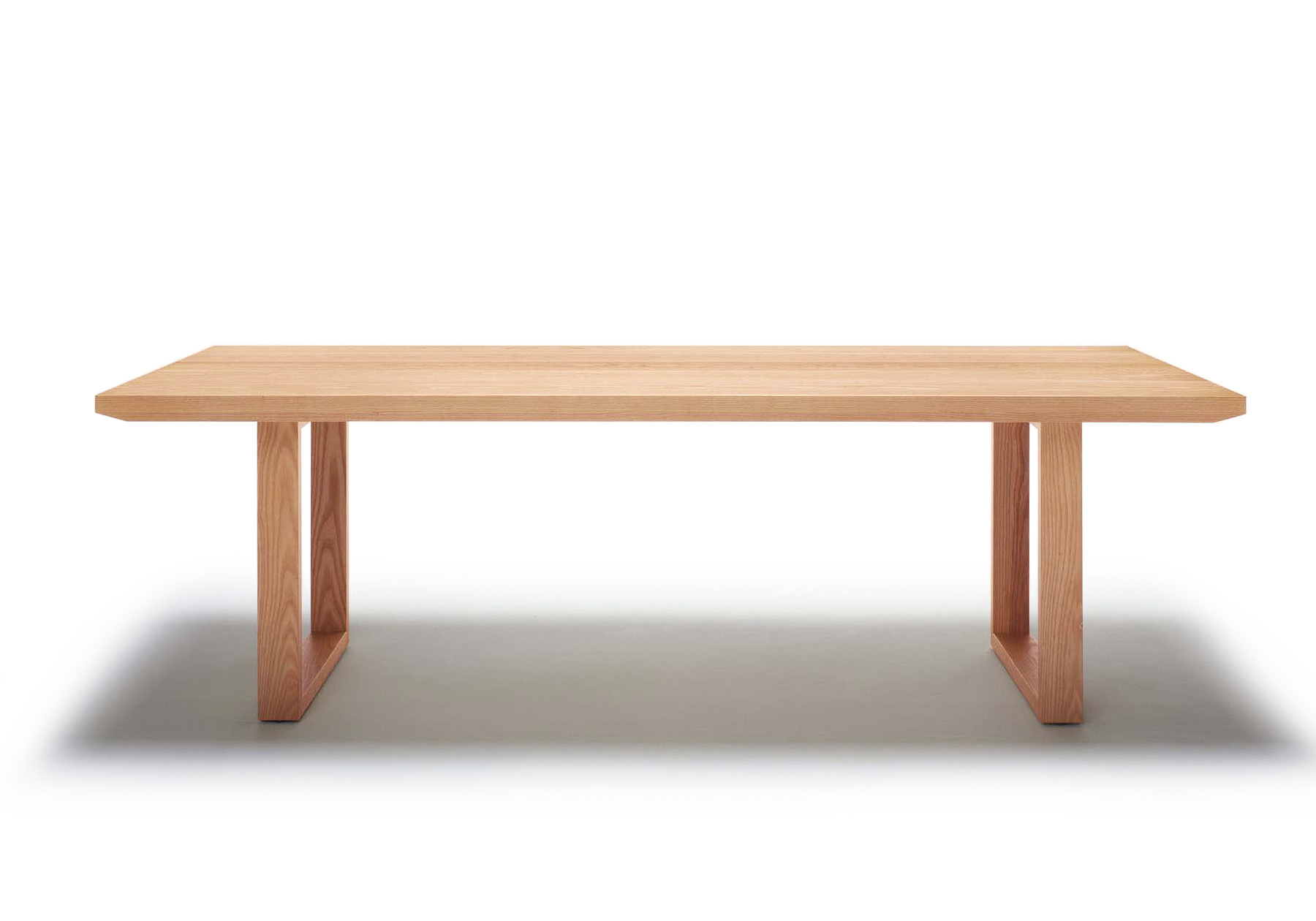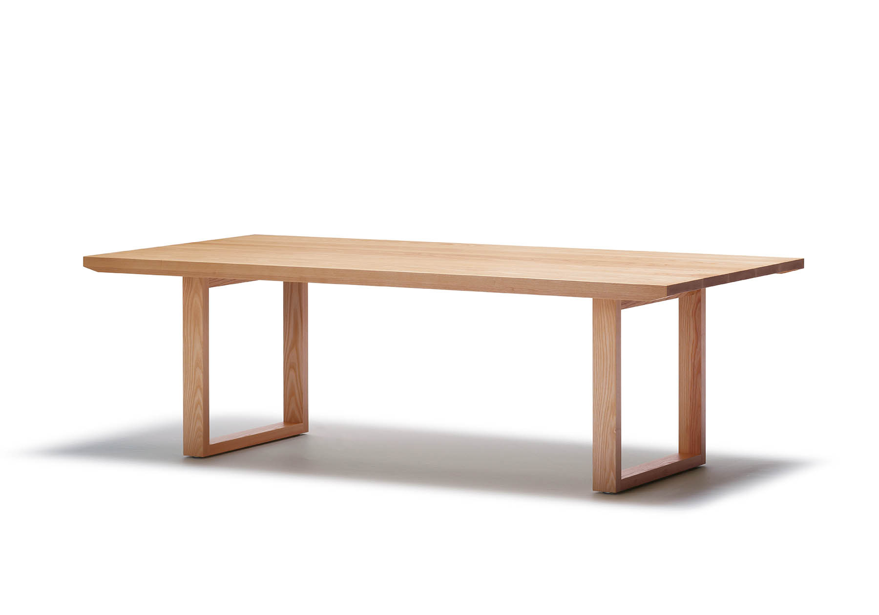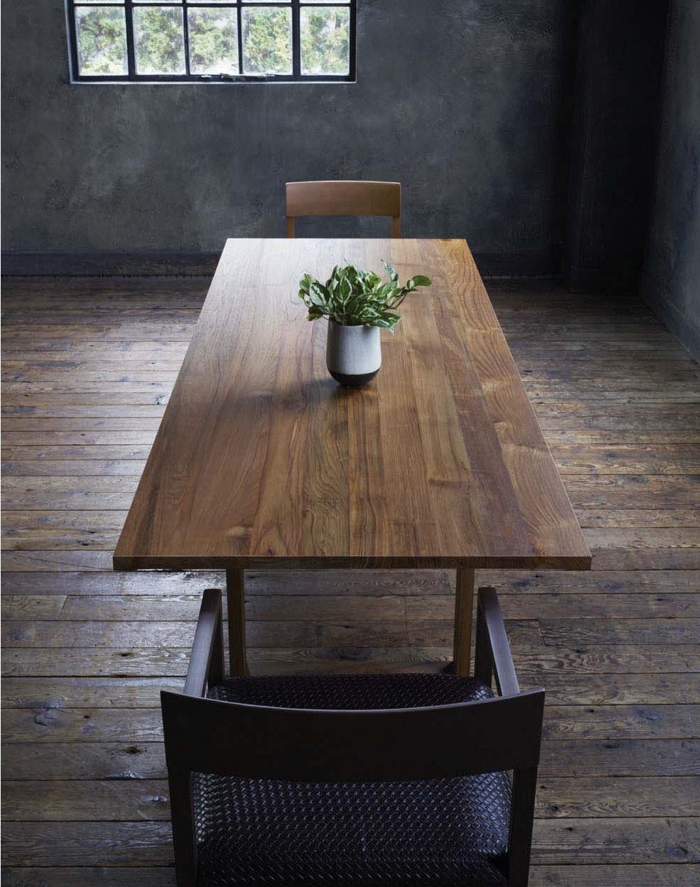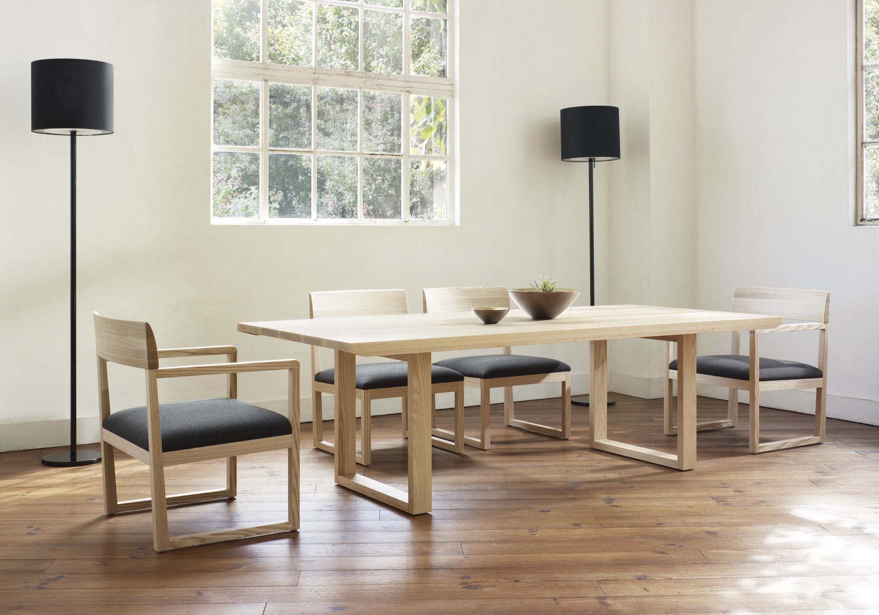 無垢素材を、天板・脚部全てにミニマルなモダンデザインに表現したダイニングテーブル。うずくりされた無垢天板は素材感を最大限に活かし、低く押さえられた高さは安定感を演出します。