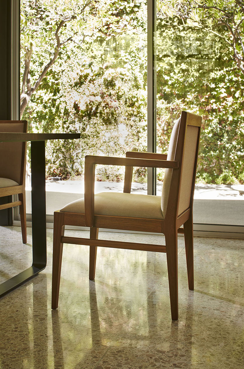無垢材のフレームを持つナチュラル感のあるダイニングチェア。ミドルサイズのゆとりある座り心地と、ノーマルなスタイルはどんなインテリアシーンにもフィットします。モダンでもヴィンテージでもない、カリフォルニアスタイルのダイニングチェアです。