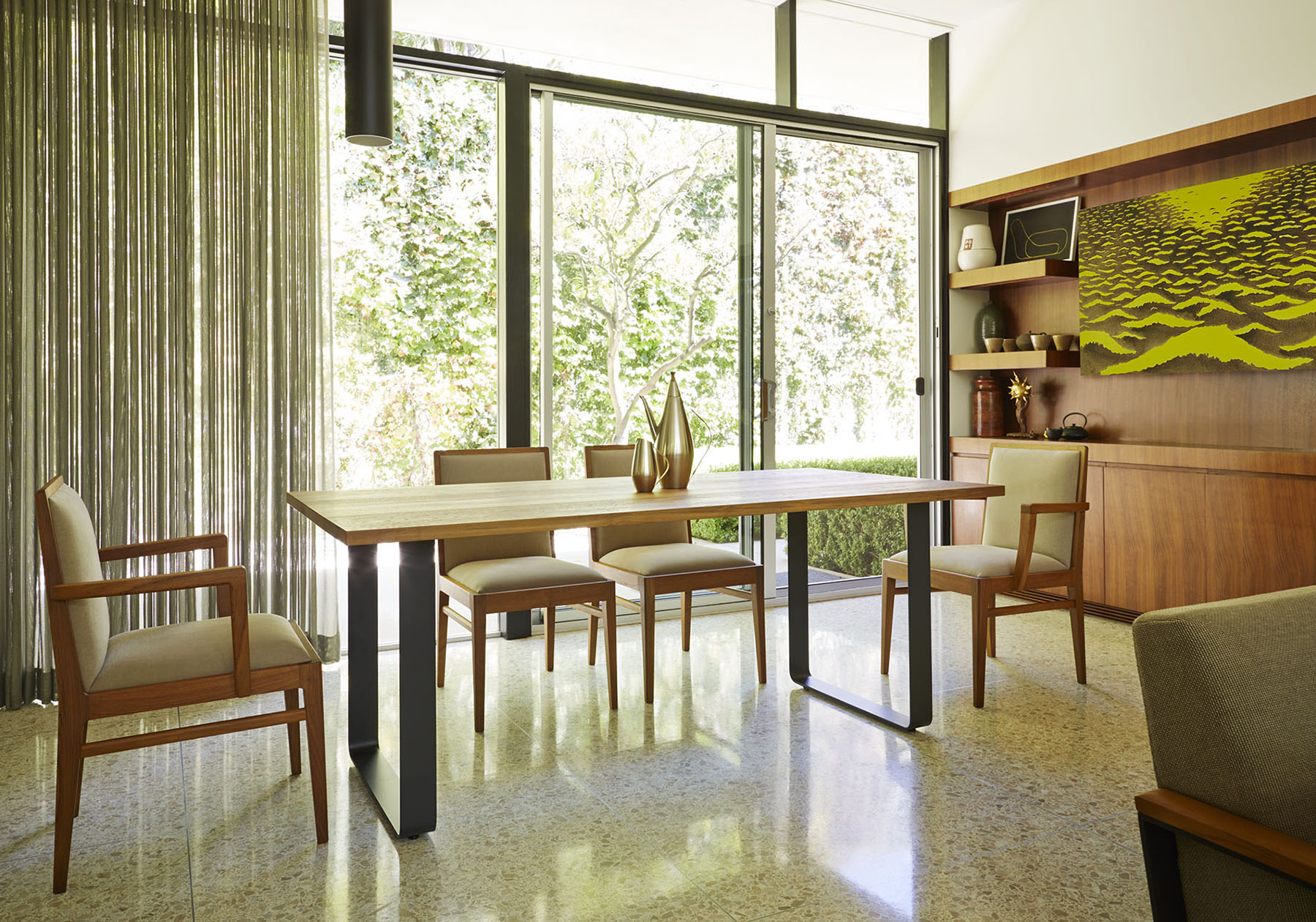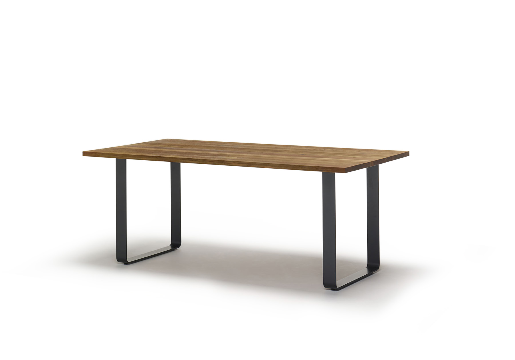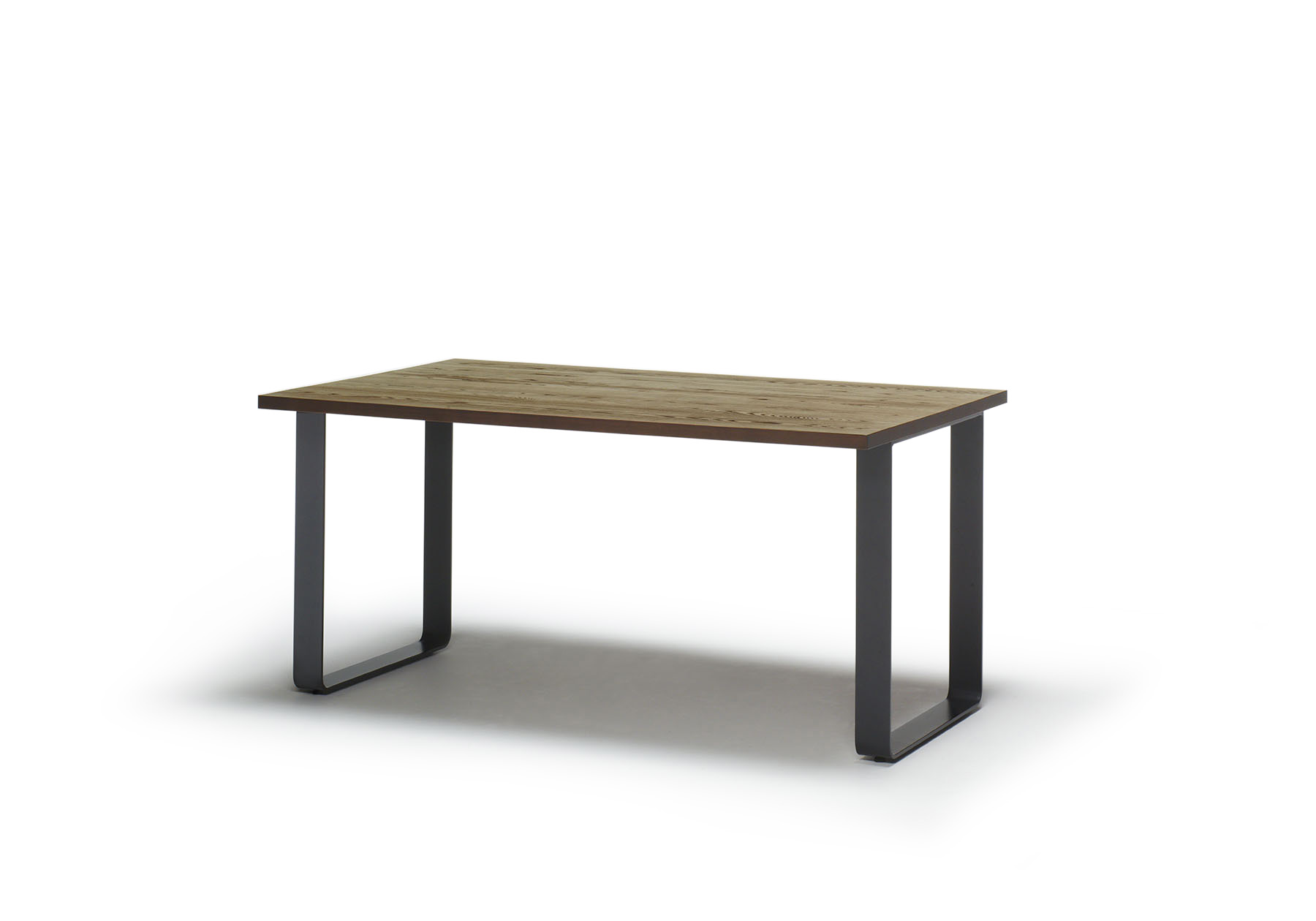 素材感を感じさせるうずくり加工の無垢天板に、ヴィンテージブラック仕上げを 加えたスチールの脚部を組み合わせたシンプルなダイニングテーブル。