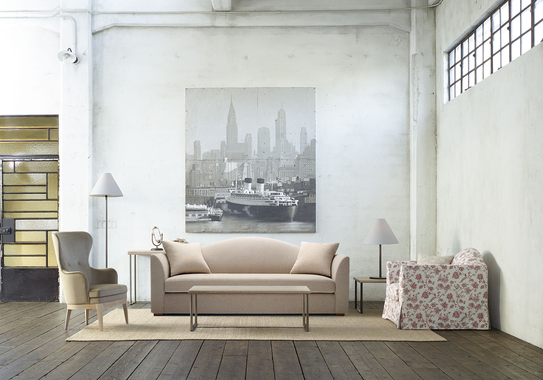 ヨーロッパの伝統的なソファを女性的にリデザインしました。スクエアなボックス形状のフォルムは空間に安定感を、アームから背につながる柔らかなカーブは、空間に優しさと華やかな美しさを与えます。シンプルな形状は、ナチュラルなファブリックから大胆な柄、華やかな花柄までご使用になるファブリックを選びません。