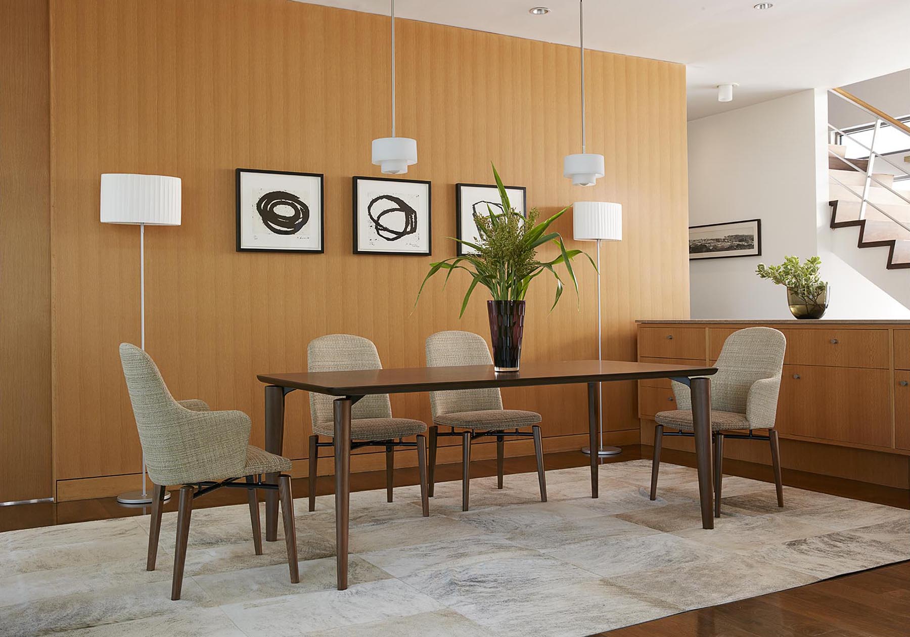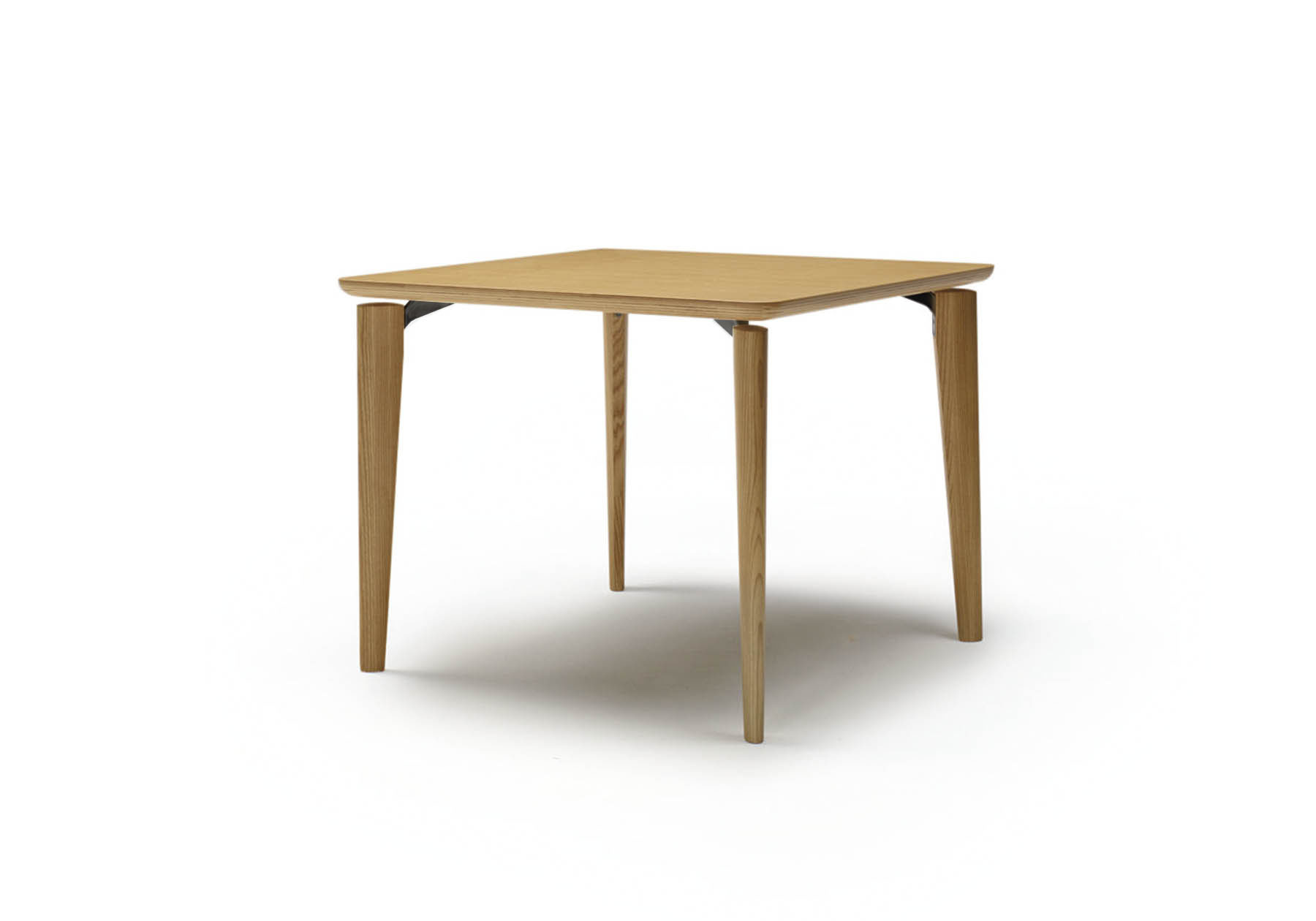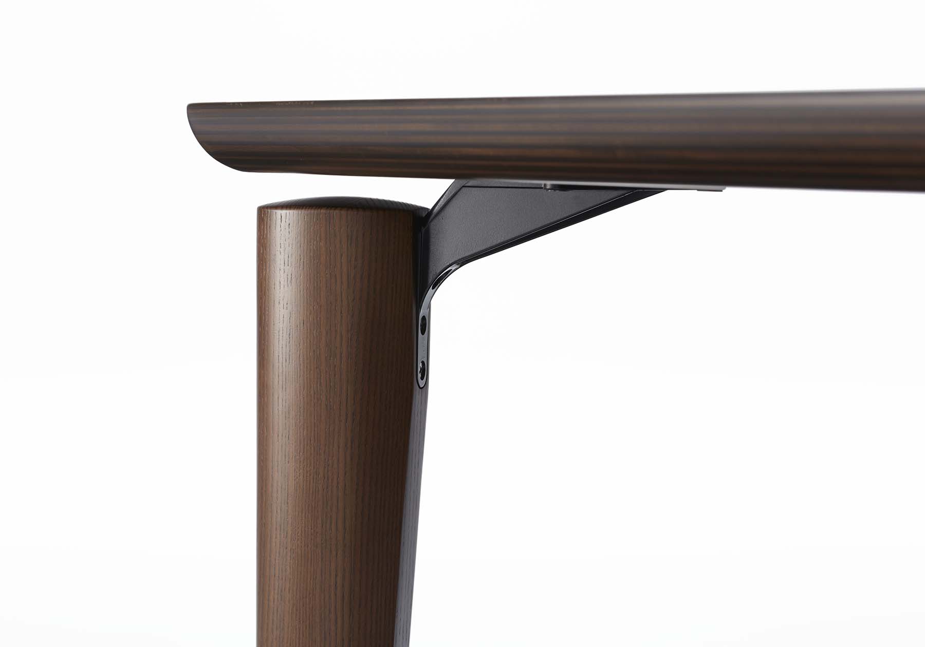 浮遊する天板にソリッドの脚部の組合わせ。浮遊するデザインは脚部を支えるアルミダイカストのジョイントパーツが可能にしています。木目も美しいホワイトアッシュ材の脚部は、楕円の断面を持ち、伸びやかで柔らかなフォルムを表現しています。