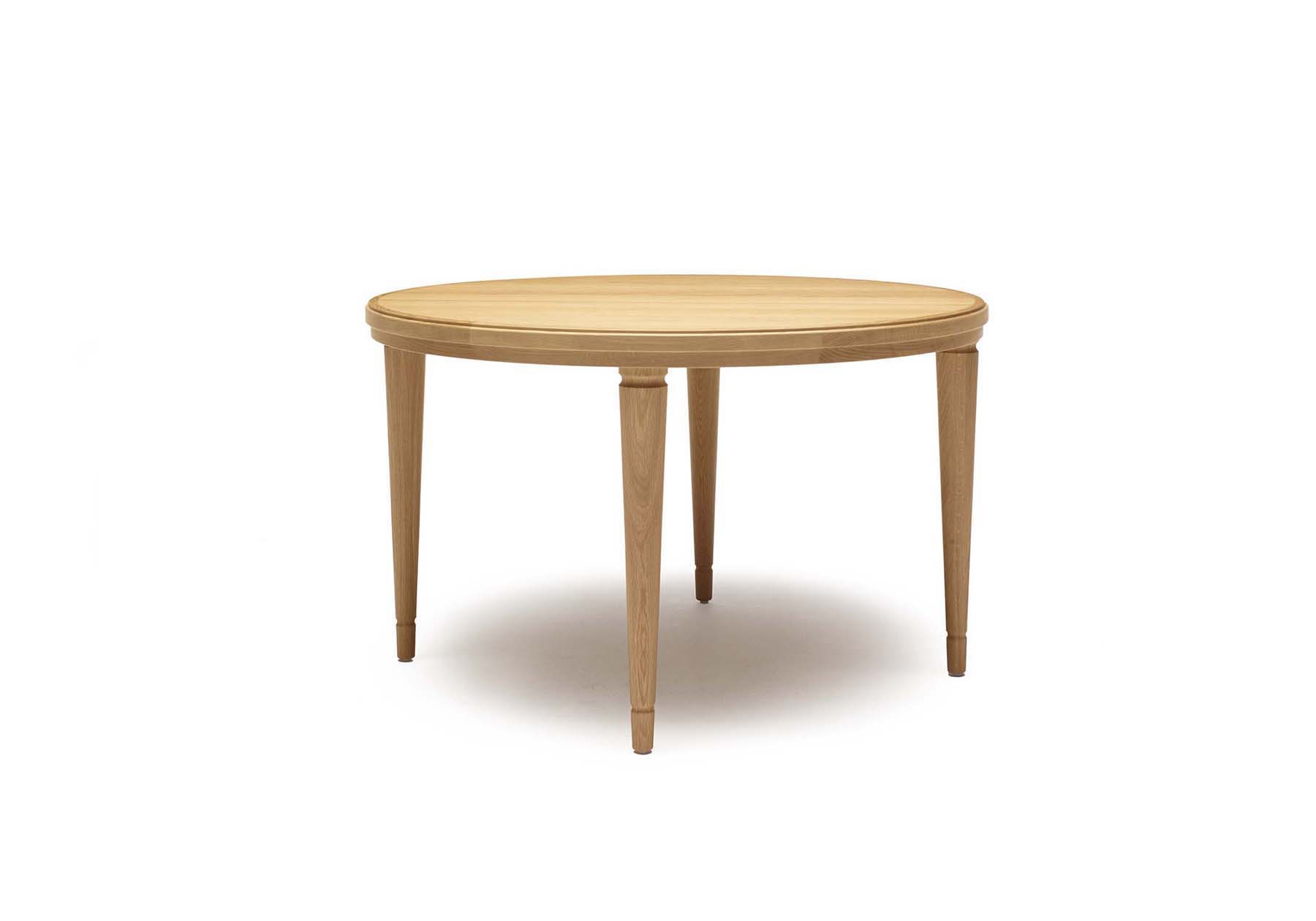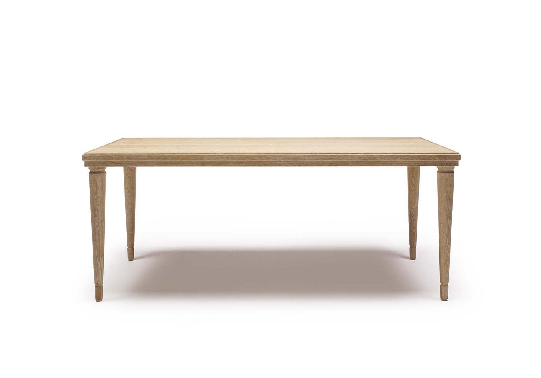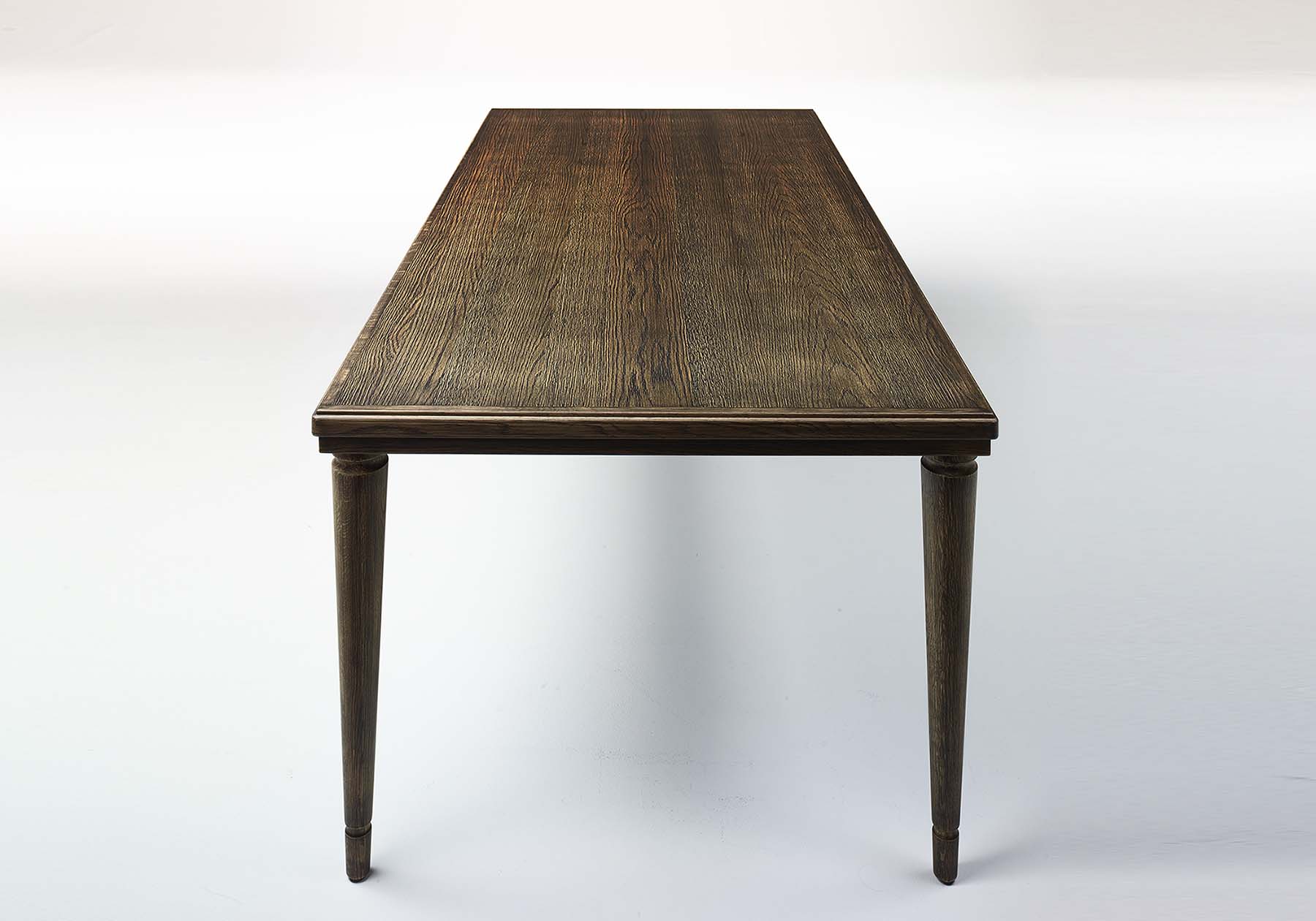 イギリスの農家のテーブルをモチーフにリデザインしました。19世紀、イギリスの農家で使われていた4本脚のテーブルが、貴族のカントリーハウスや、キッチンのモーニングテーブルとして使われました。実用的な4本脚は、作業用のテーブルとして安定感を求めるシーンにも使われました。幕板が存在する為にアームチェアなどフォーマルな空間には不向きでしたが、幕板を廃したシンプルな構造にし、フォーマルにもカジュアルにも両方のシーンにお使いいただけるダイニングテーブルになりました。