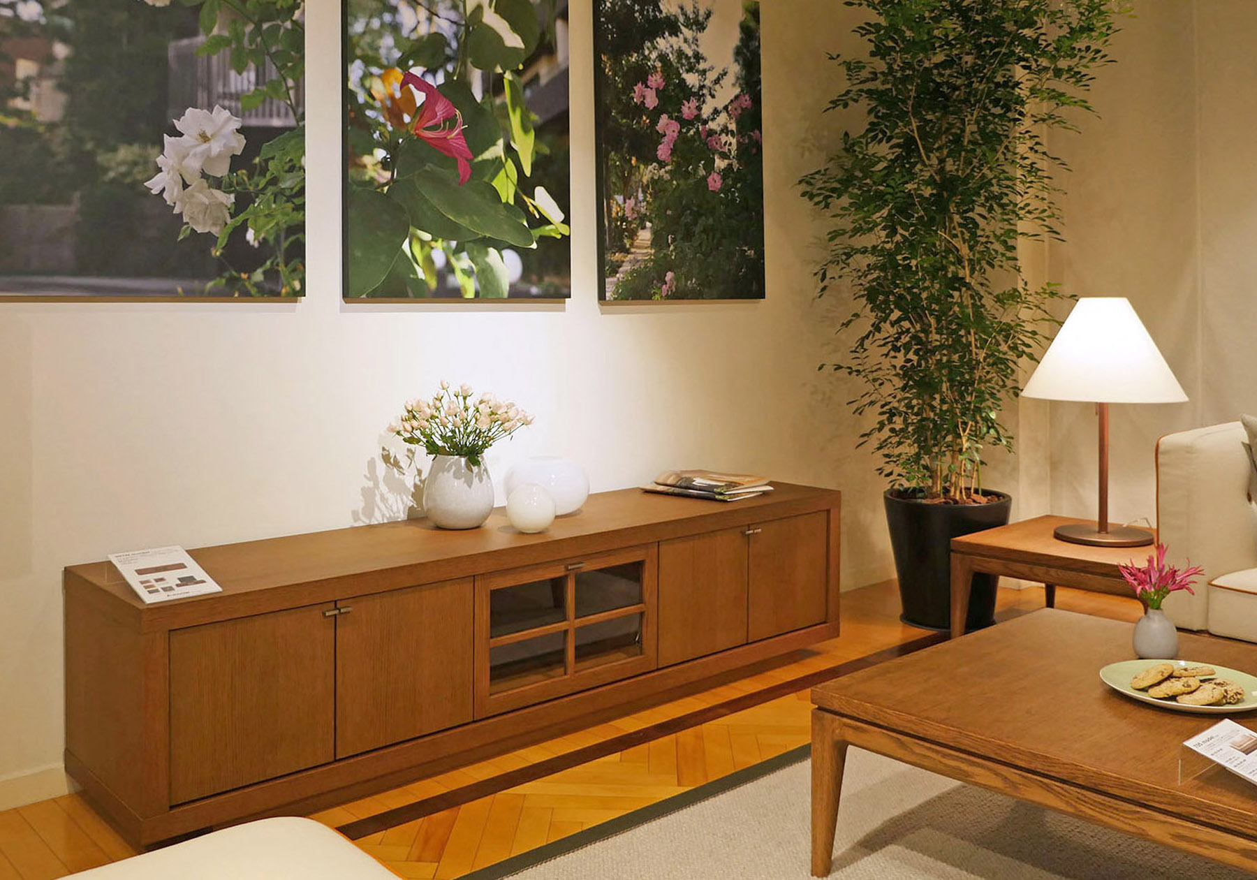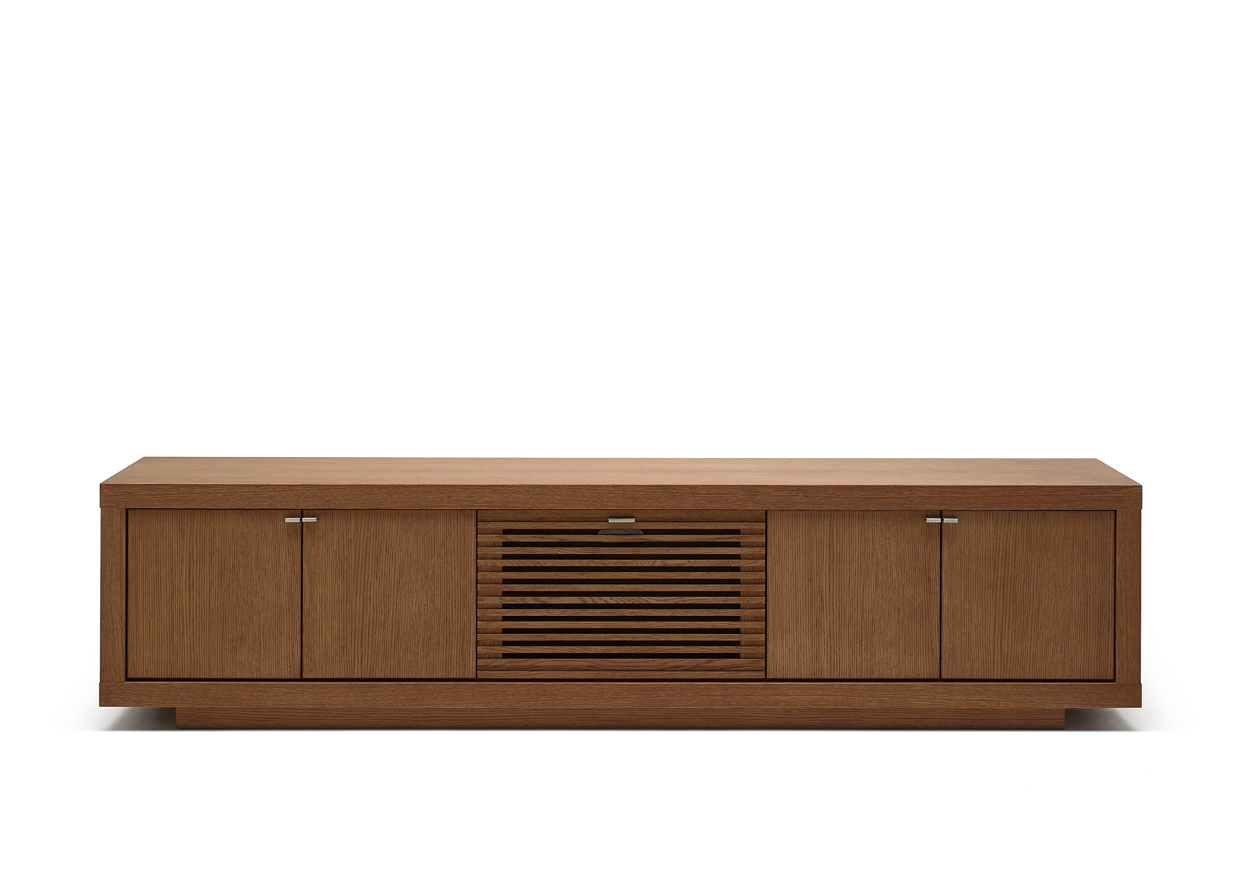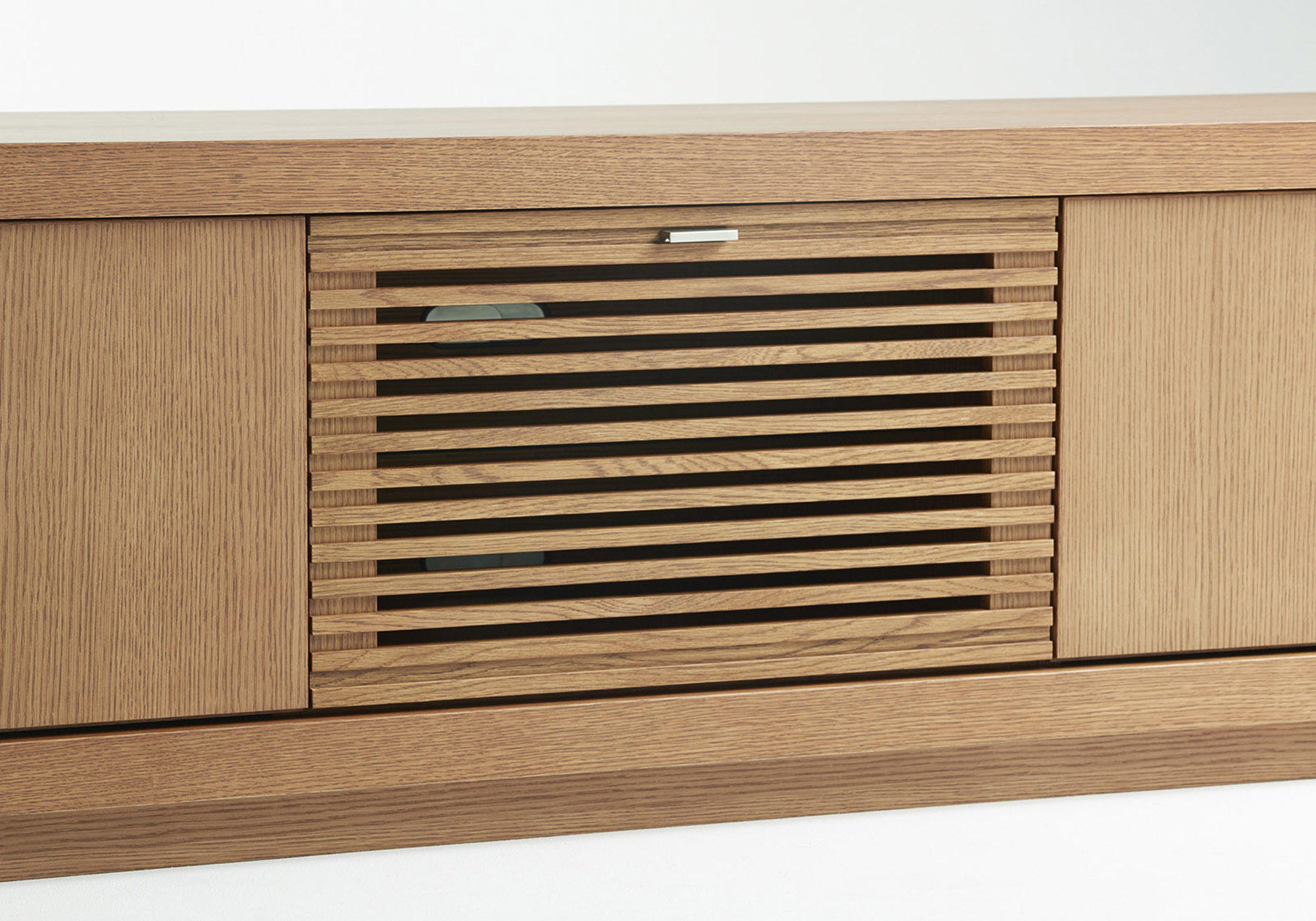 素材はナチュラル感溢れるオーク材の荒柾目を使用。オープンなタイプと、扉のあるクローズタイプを用意。クローズタイプには、扉同じ素材の両側の開き扉と、センターの機器を入れるフラップ扉には、フラットな板扉、ガラスをはめ込んだ框扉、スタイリッシュなルーバータイプを用意しました。開き扉にはソフトに閉まるダンパー機能を持たせ、フラップ扉に使用するステーにもソフトダウン機能があり、堅牢で上質な操作性を感じていただけます。