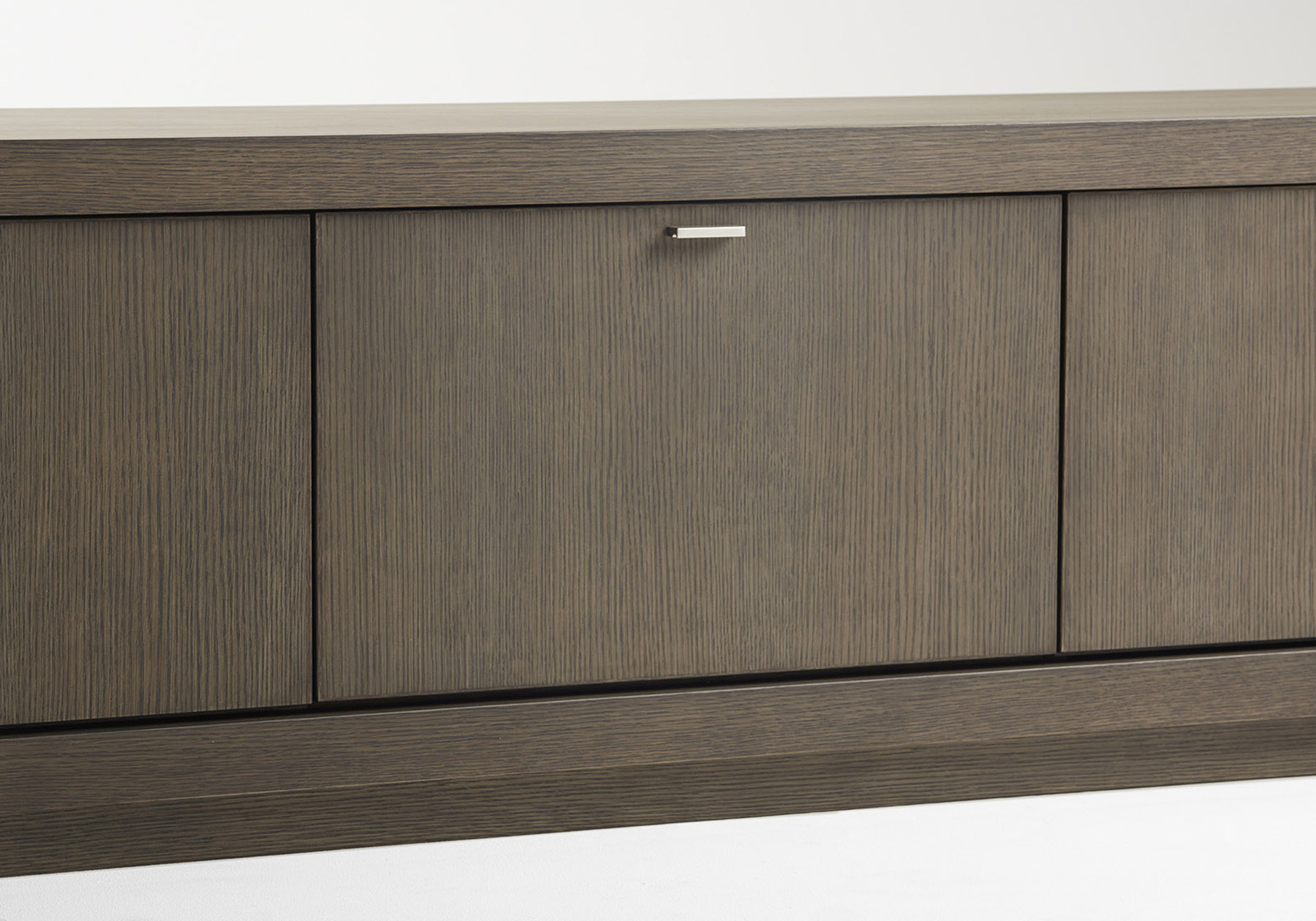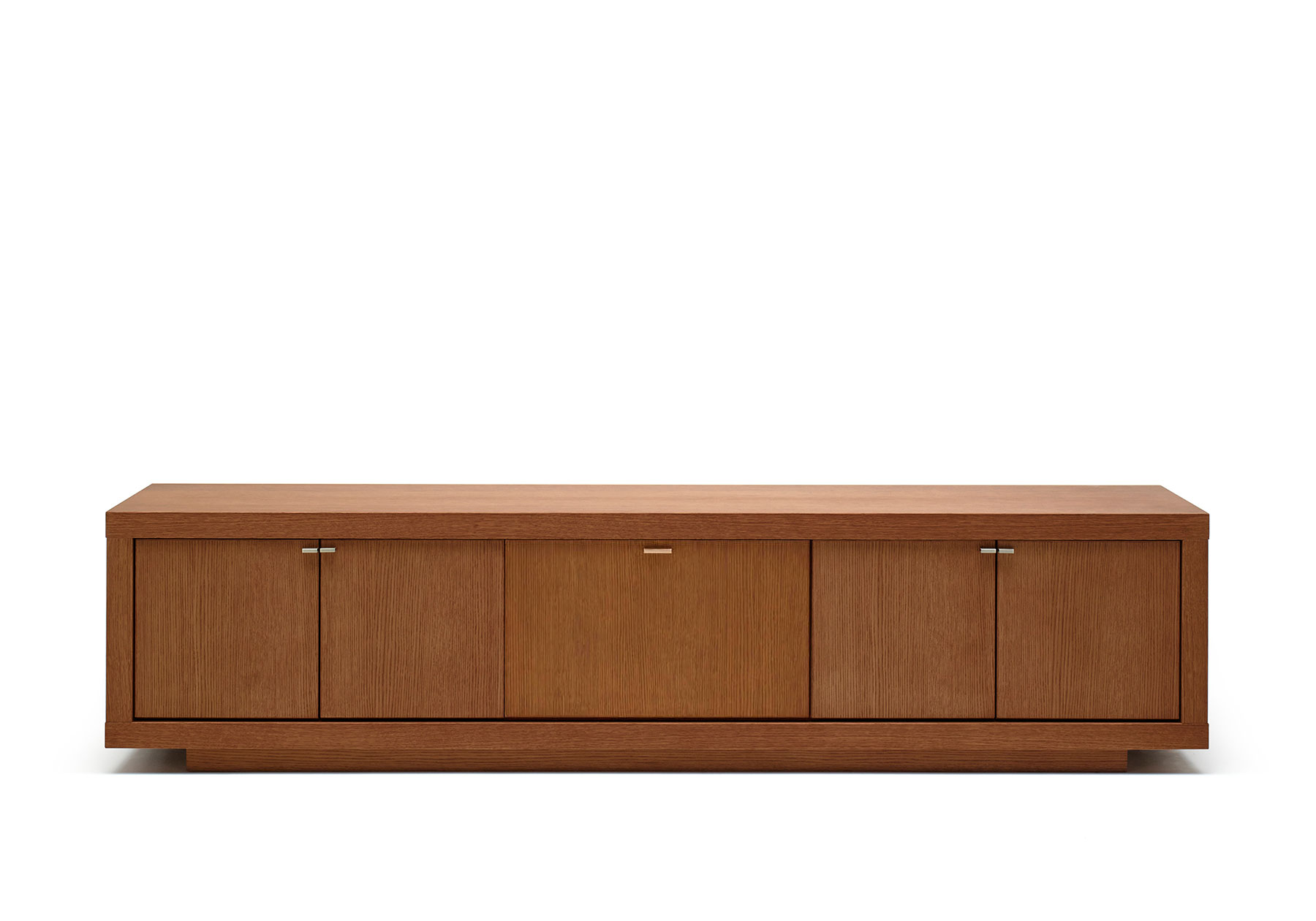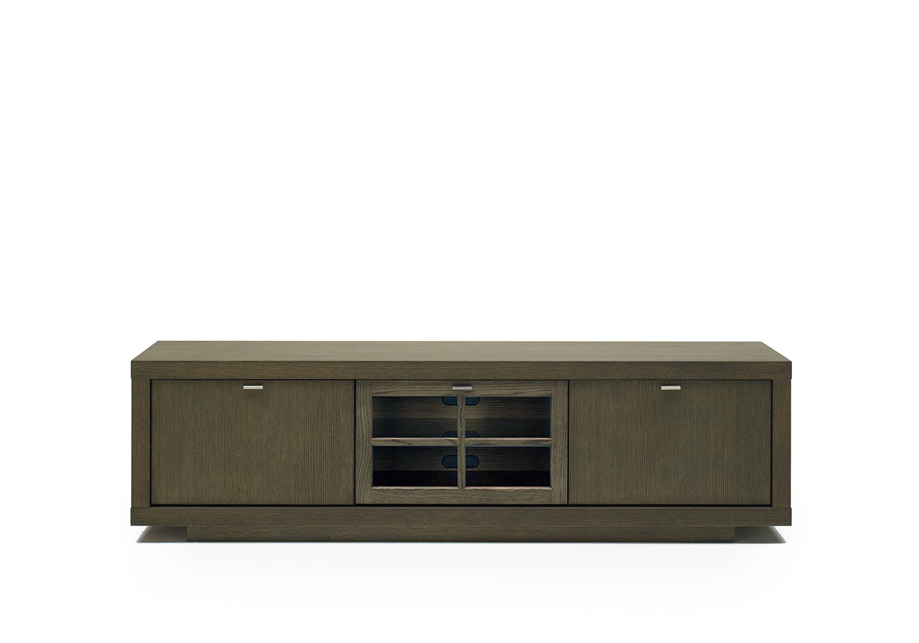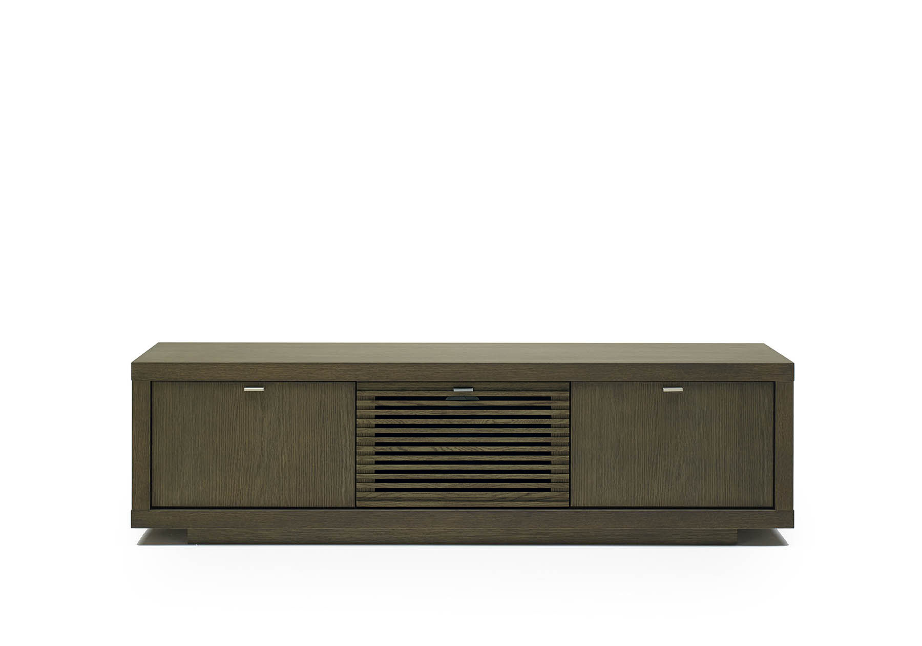 素材はナチュラル感溢れるオーク材の荒柾目を使用。オープンなタイプと、扉のあるクローズタイプを用意。クローズタイプには、扉同じ素材の両側の開き扉と、センターの機器を入れるフラップ扉には、フラットな板扉、ガラスをはめ込んだ框扉、スタイリッシュなルーバータイプを用意しました。開き扉にはソフトに閉まるダンパー機能を持たせ、フラップ扉に使用するステーにもソフトダウン機能があり、堅牢で上質な操作性を感じていただけます。