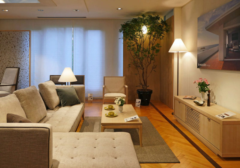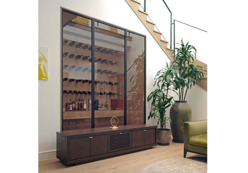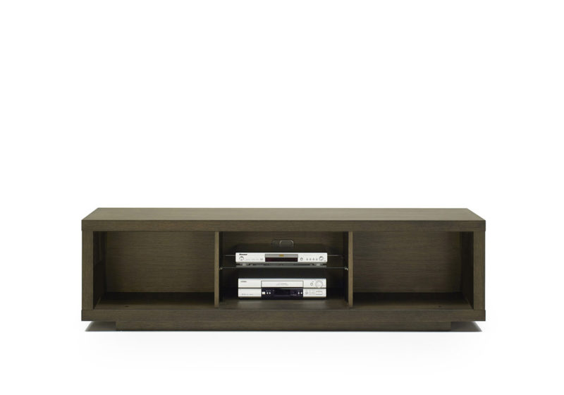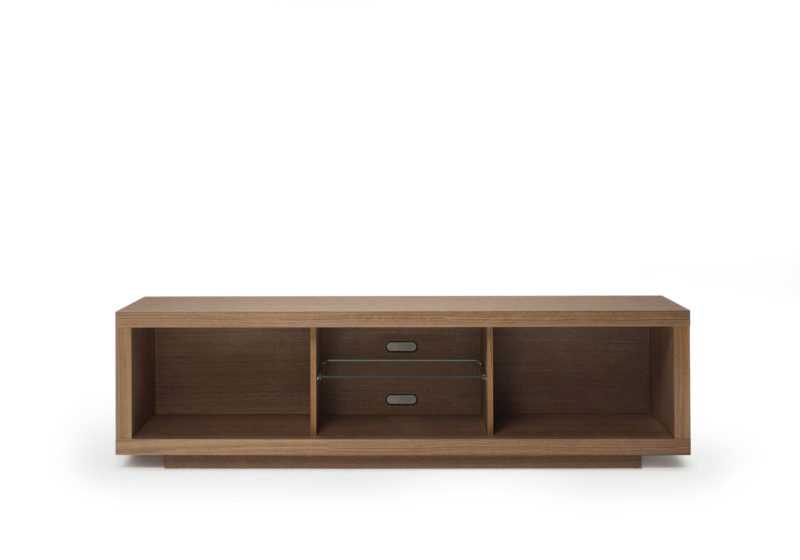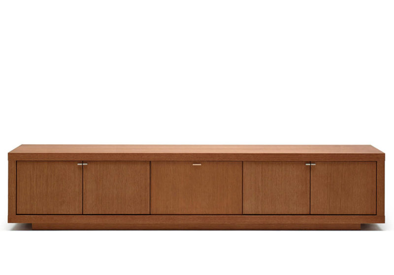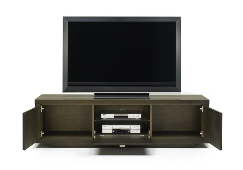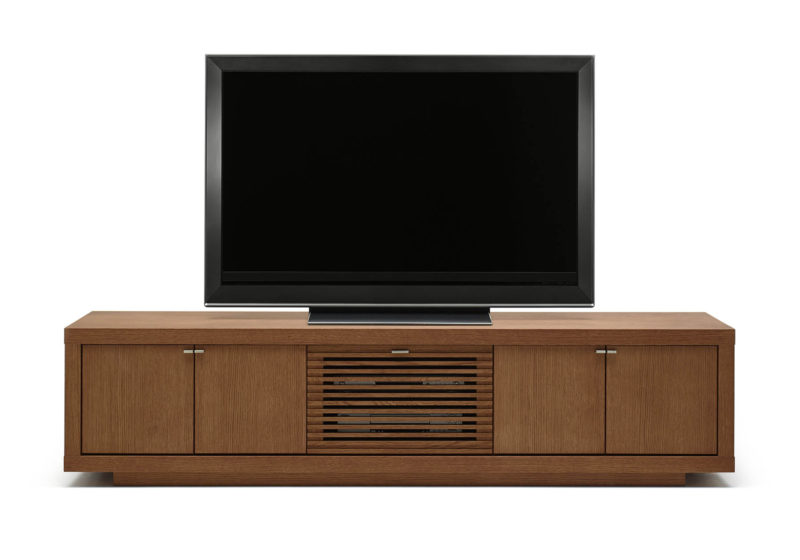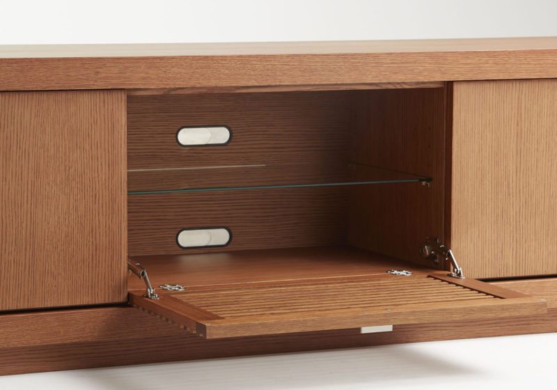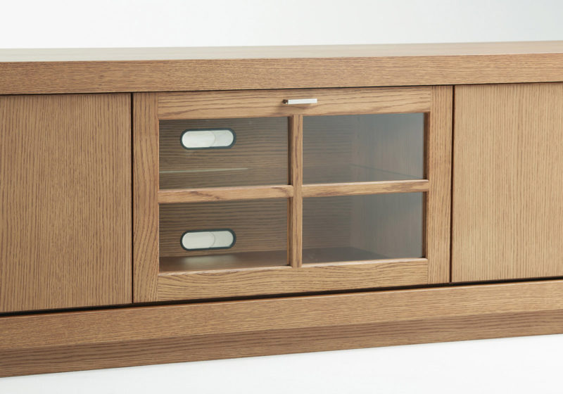 素材はナチュラル感溢れるオーク材の荒柾目を使用。オープンなタイプと、扉のあるクローズタイプを用意。クローズタイプには、扉同じ素材の両側の開き扉と、センターの機器を入れるフラップ扉には、フラットな板扉、ガラスをはめ込んだ框扉、スタイリッシュなルーバータイプを用意しました。開き扉にはソフトに閉まるダンパー機能を持たせ、フラップ扉に使用するステーにもソフトダウン機能があり、堅牢で上質な操作性を感じていただけます。
