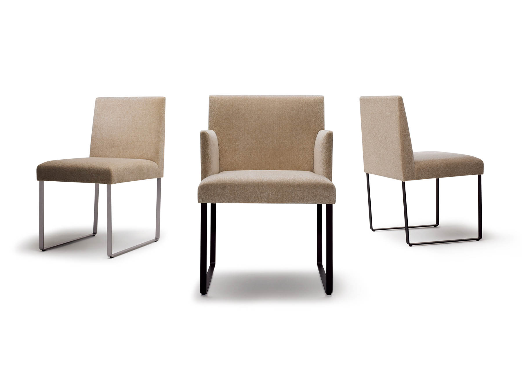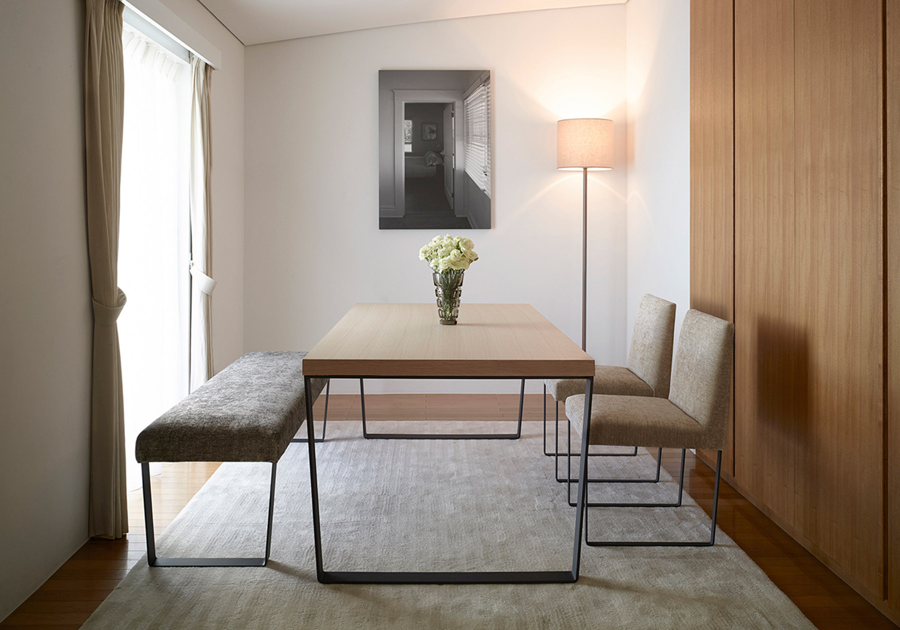 スクエアなフォルムの中に柔らかなファブリックのライン、ゆとりのあるサイズ感と上質な座り心地のダイニングチェアです。シャープさの中に安定感のあるスチール脚部と、和のテイストにもフィットする木製脚部のバリエーションを持ったチェアシリーズです。
