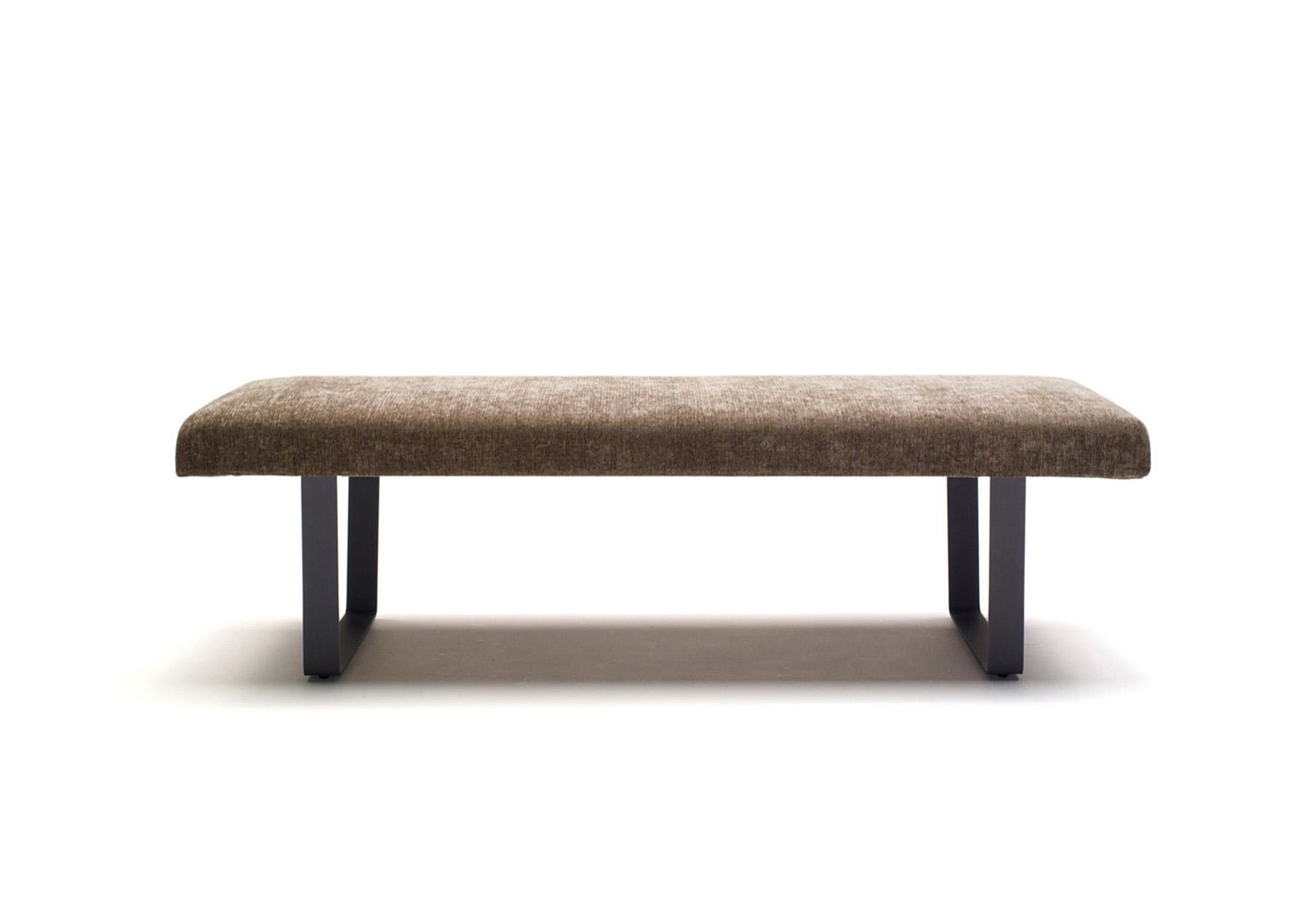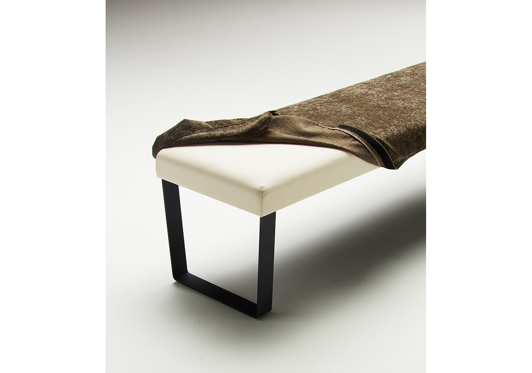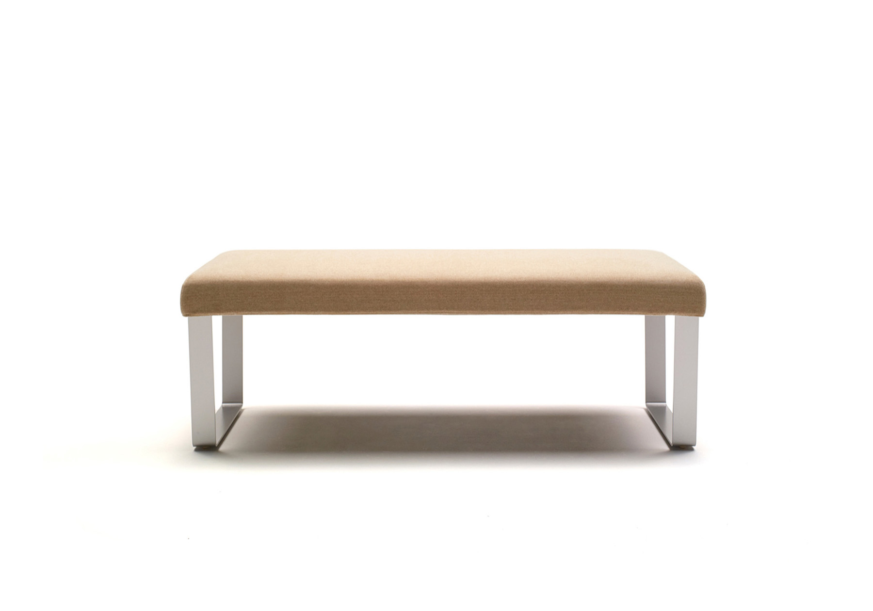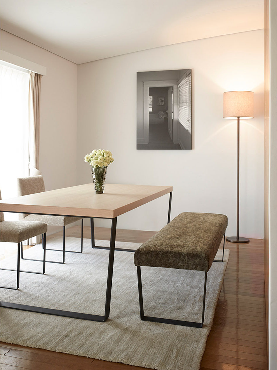 シンプルでスクエアな 101 チェアと、ダイニングテーブル 105 にぴったりのスチール脚ベンチです。ダイニング使用に便利なカバーリング仕様の座は、奥行きがあり、コントラクト空間のベンチとしても活躍します。