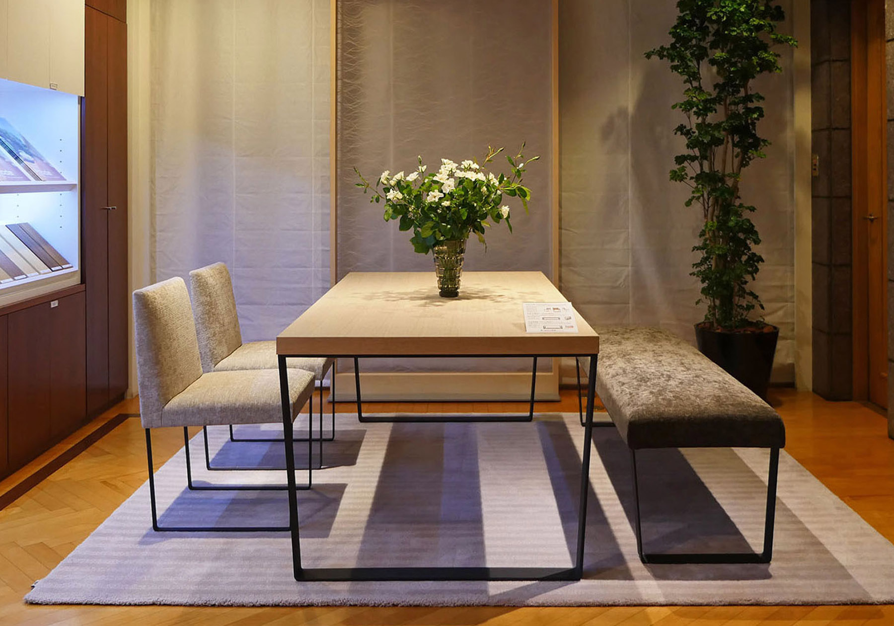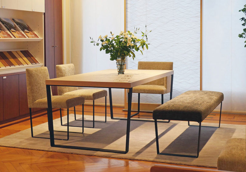 人気のスチール脚のダイニングテーブル105のオーク仕様です。天板に使われるオーク突板は荒柾目を使用。柾目の中でも、よりナチュラル感を感じていただける導管間の広い柾目です。夏目と冬目の豊かさとホワイトオークらしい斑も、よりナチュラルさを出しています。スチール脚のヴィンテージブラックとの相性も良く、カリフォルニアスタイルのシャヴィーな空間にもお使いいただけます。