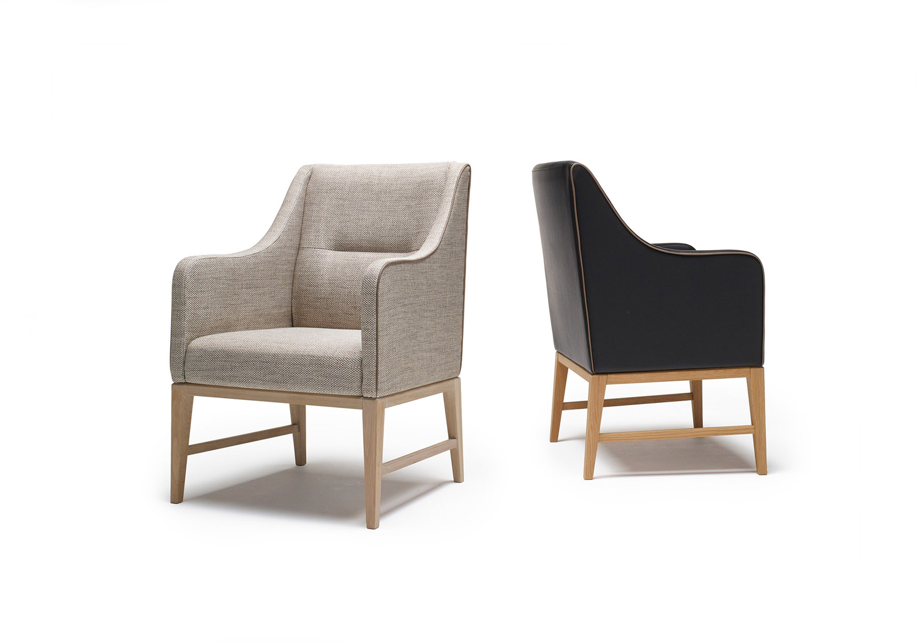 座と背には弾性ベルトをクロスに編んだクッションを下地に使用。深くて柔らかな掛け心地を実現しました。滑らかで快適なアームラインにはオプションで革のパイピング仕様をお選びいただけます。オーク材の脚部との組合わせは、ナチュラルな印象を空間に与え様々なフォーマル空間にお使いいたけます。