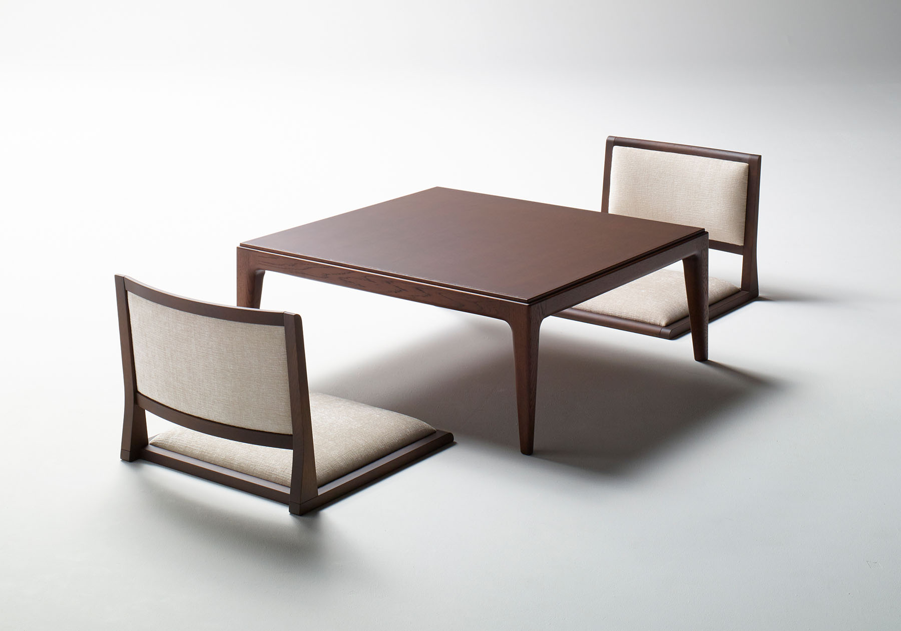 底付き感の少ない座クッションのA タイプと、座布団を組み合わせてお使いいただくC タイプのバリエーションからお選びいただけます。C タイプは快適に座布団を使用いただけるように滑り止め効果のあるレザーを使用しました。ダイニングチェアのMD-103N と統一感のあるデザインは、リビングに畳のある日本の住宅にモダンスタイルのインテリアシーンを創りだします。