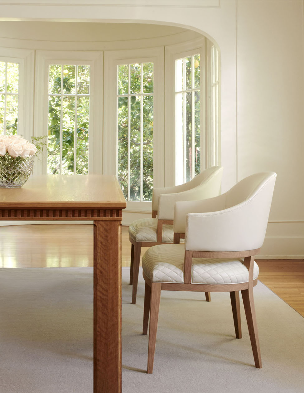 フレームは堅牢な北米産のホワイトオーク材を使用し、優しくホールドする背はビーチ材の成型合板を使用、その上にウレタンフォームを何層にも重ね身体を優しく包こみます。座にはファニチャーメッシュを下地に使用し、深くて柔らかな掛け心地を実現しました。一つ上のバリエーションとして上質な天然皮革をキルティングした座も用意しました。長くお使いいただける上質なフォーマルチェアです。