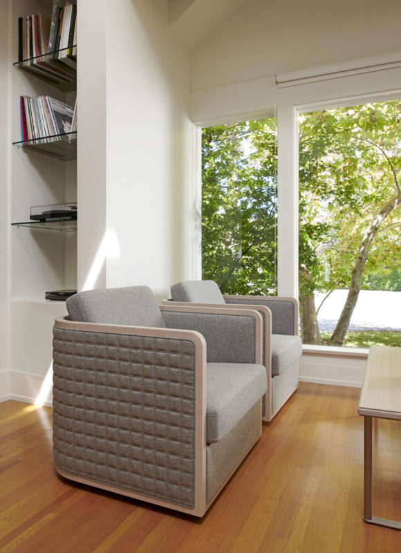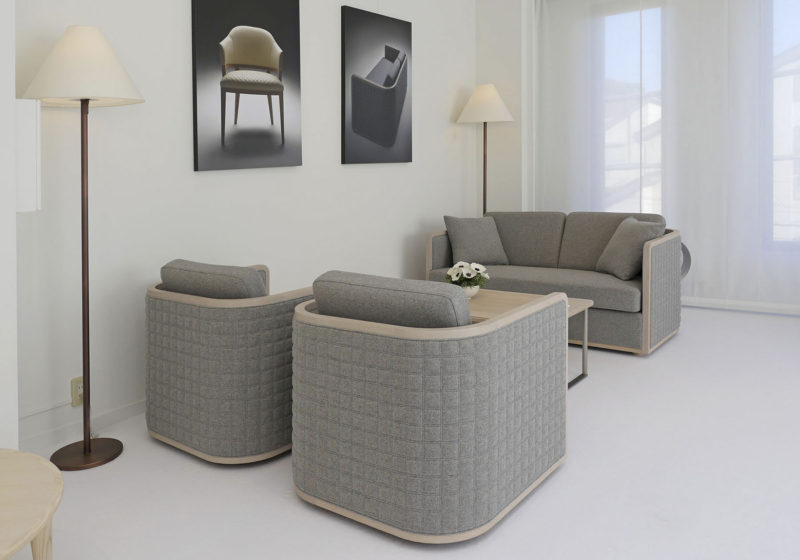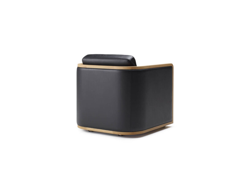 1人用のラウンジチェアにはキャスター脚を使用してオフィスなどでの利便性も追求しました。寸法は大きすぎず、奥行きは750ミリとコンパクトですが、ゆったりとした掛け心地です。オフィスやホテルのラウンジだけでなく、ホテルの客室や住宅にも使用できるサイズ感で、オーク材の木フレームは布痛み防止にもなります。