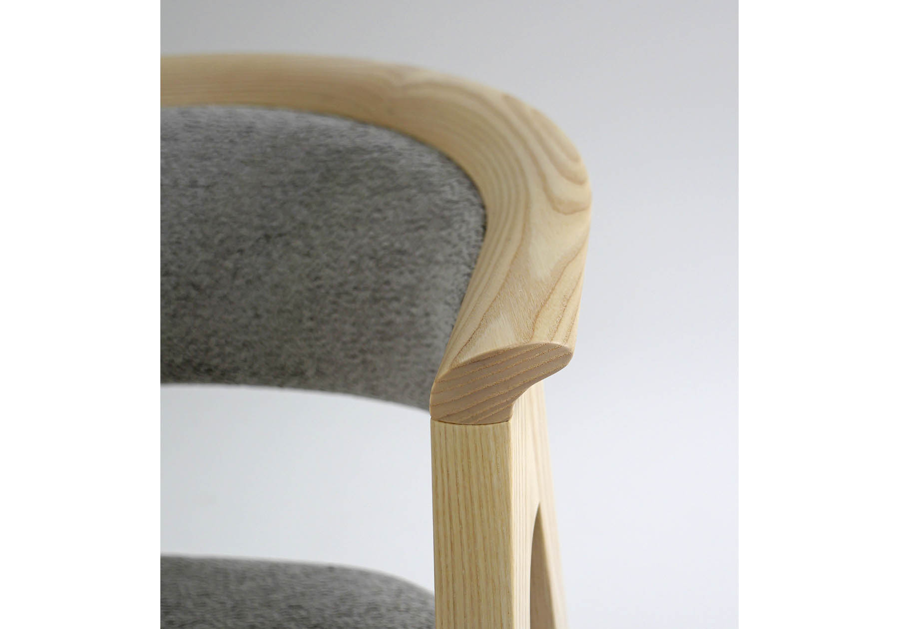 ラウンジチェアのようなゆったりとしたサイズ感で、長く快適に座る事を目的に設計しました。脚部フレームの構造に使用するホワイトアッシュ材の削ぎを少なくし、木材の無駄を抑える成型合板を使用し、できるだけ少ないパーツ構成にしました。人の触れる箇所には、汚れの付着しにくく清掃時しやすい無垢材を使用して、座と背には適度な隙間を設け、埃やゴミが貯まらないようになっています。近親者が永く座る場所や、公共の場でのメンテナンス性にもこだわりました。