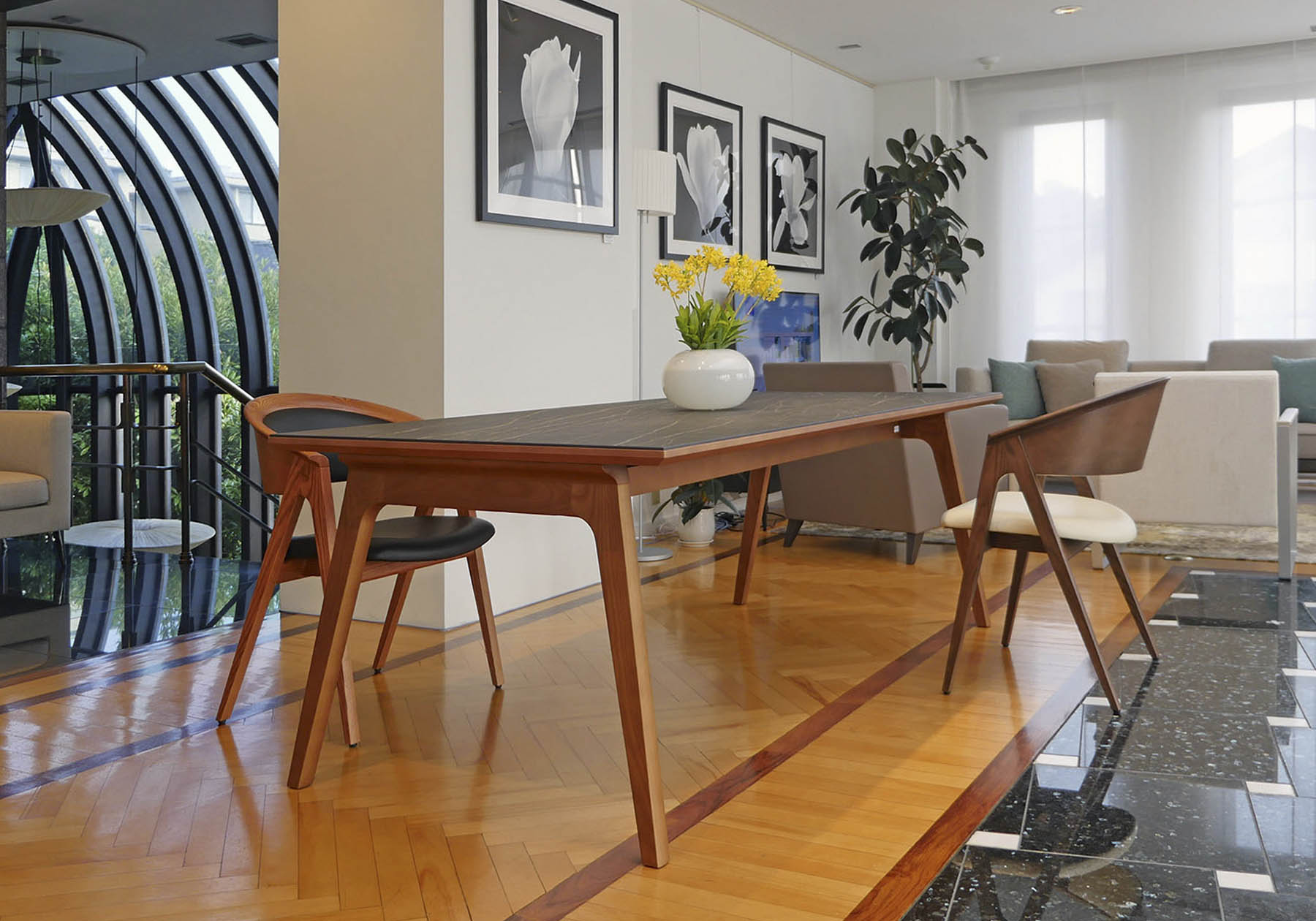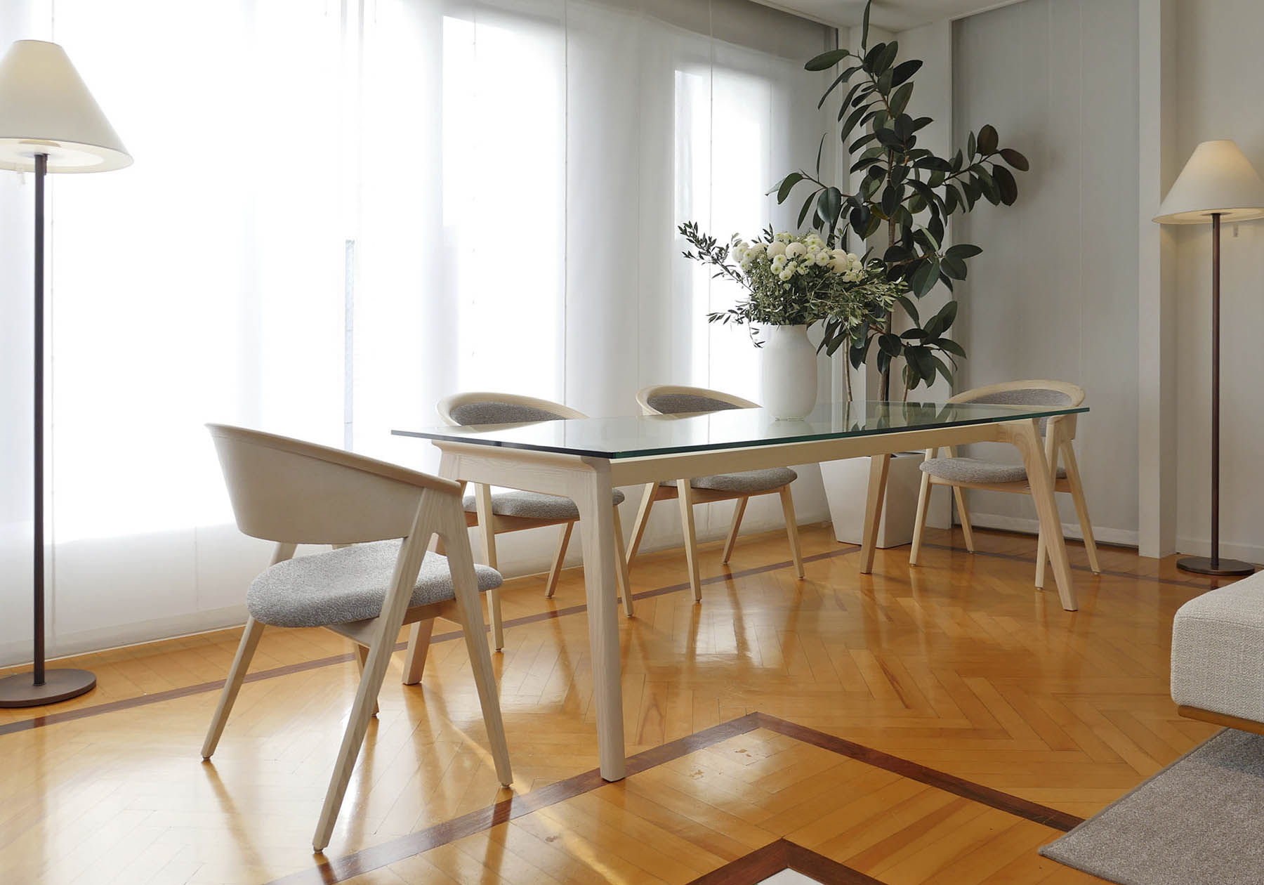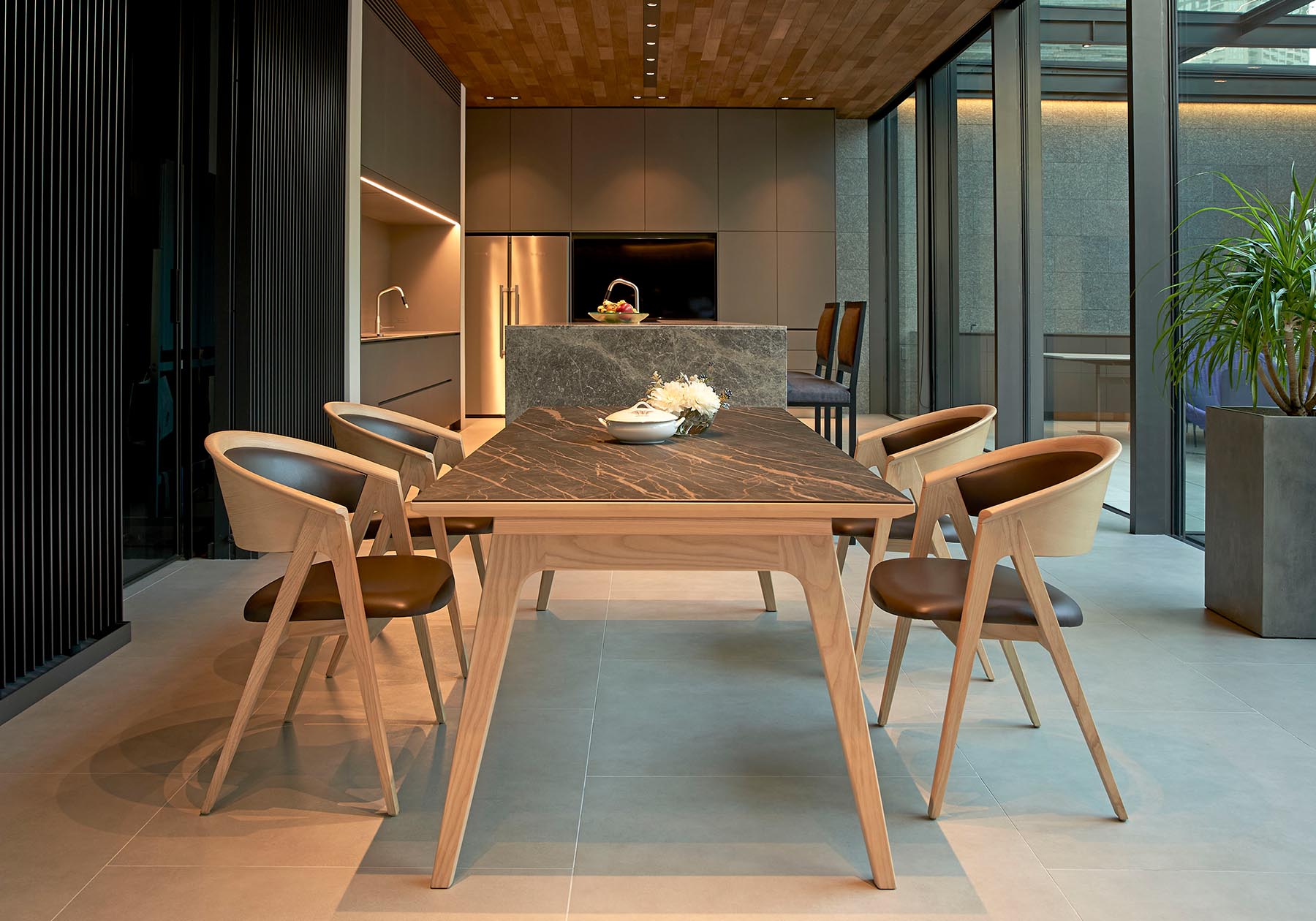1950 年代のアメリカで花開いた北欧モダンデザインのヴィンテージ家具を意識したデザインです。自然の素材を使い無駄のないデザインと、クラフト感のある優しいフォルムを創りました。手が触れるアーム部は手触りの良い形状で、ホワイトアッシュ材の杢目を美しく出したアームが優しく背を包みます。ゆったりとしたダイニングシーンからミーティングチェアやオフィスチェアとして長時間快適にお使いいただけます。