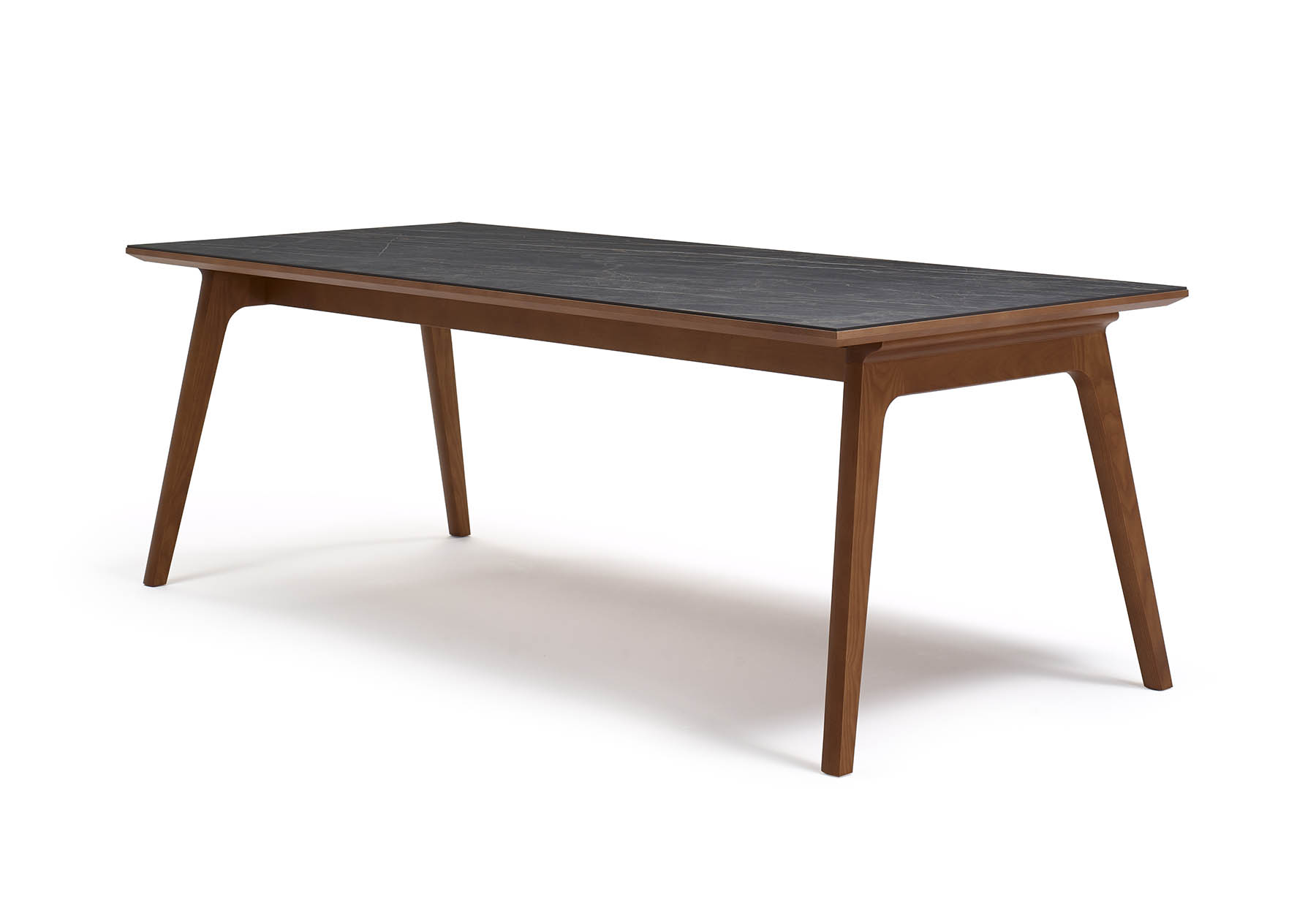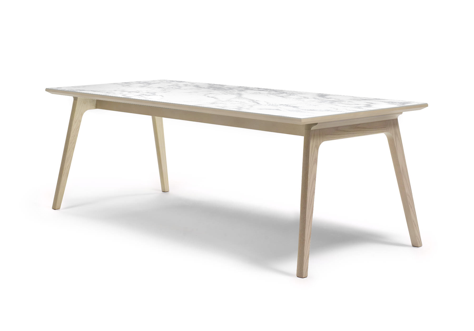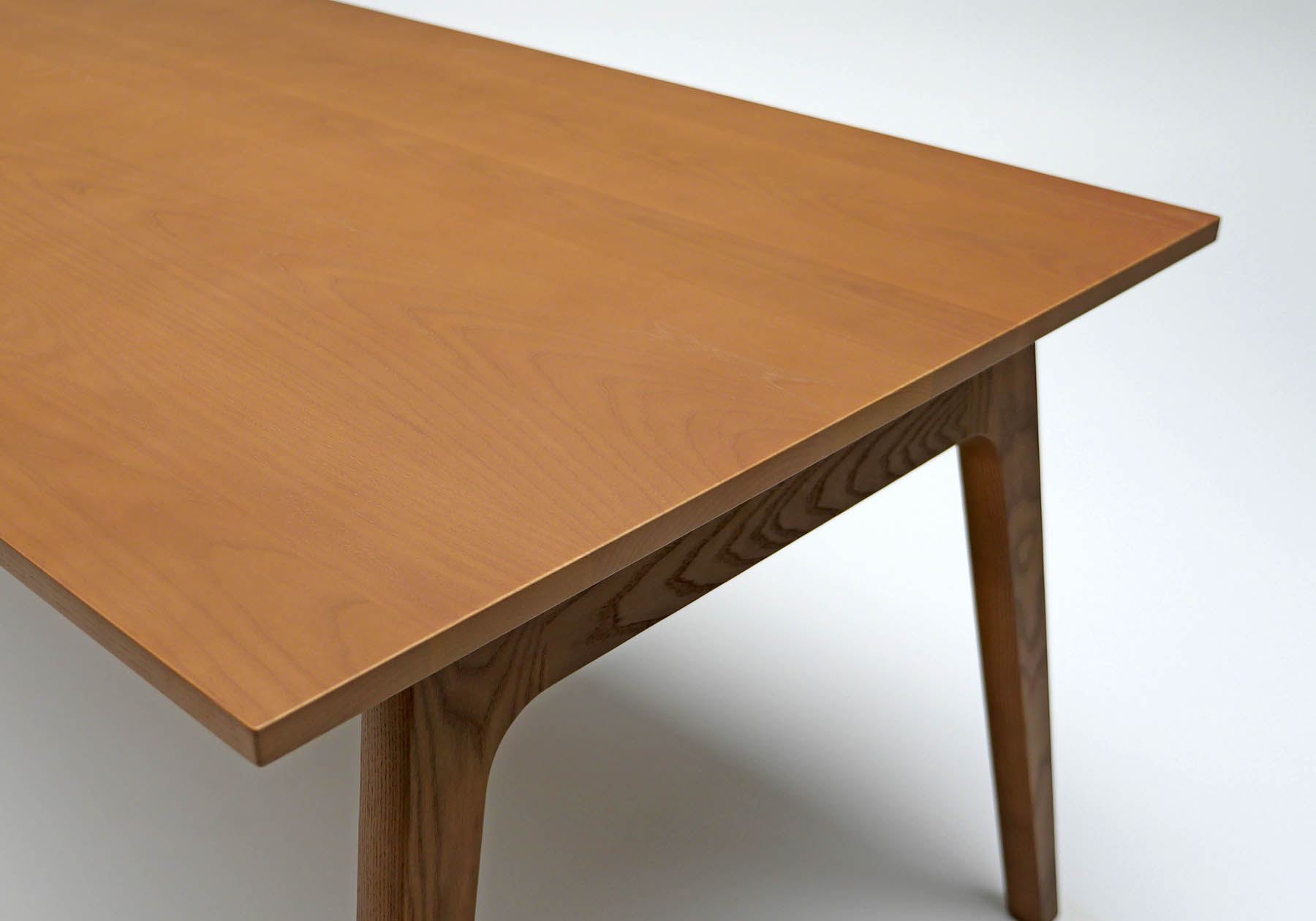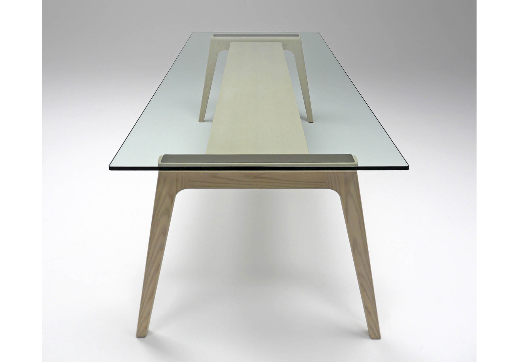 製品構造は重量のある天板を支えるために、高強度になる特殊な接合部を設計しました。ホワイトアッシュ材の脚部と貫を接合部する部分は、透明ガラス時の視線から接合方法が見えないようにデザイン。脚部に使用するホワイトアッシュ材の削ぎを少なくし、木材の無駄をできるだけ少なくしたパーツを使用しました。ガラステーブルは15ミリの重厚なガラスを使用、それを支える軽やかな脚部のガラス天板受けには天然皮革を使用しています。ホワイトアッシュの木天板と大理石模様のセラミック素材は脚部にボルトでしっかりと止められます。