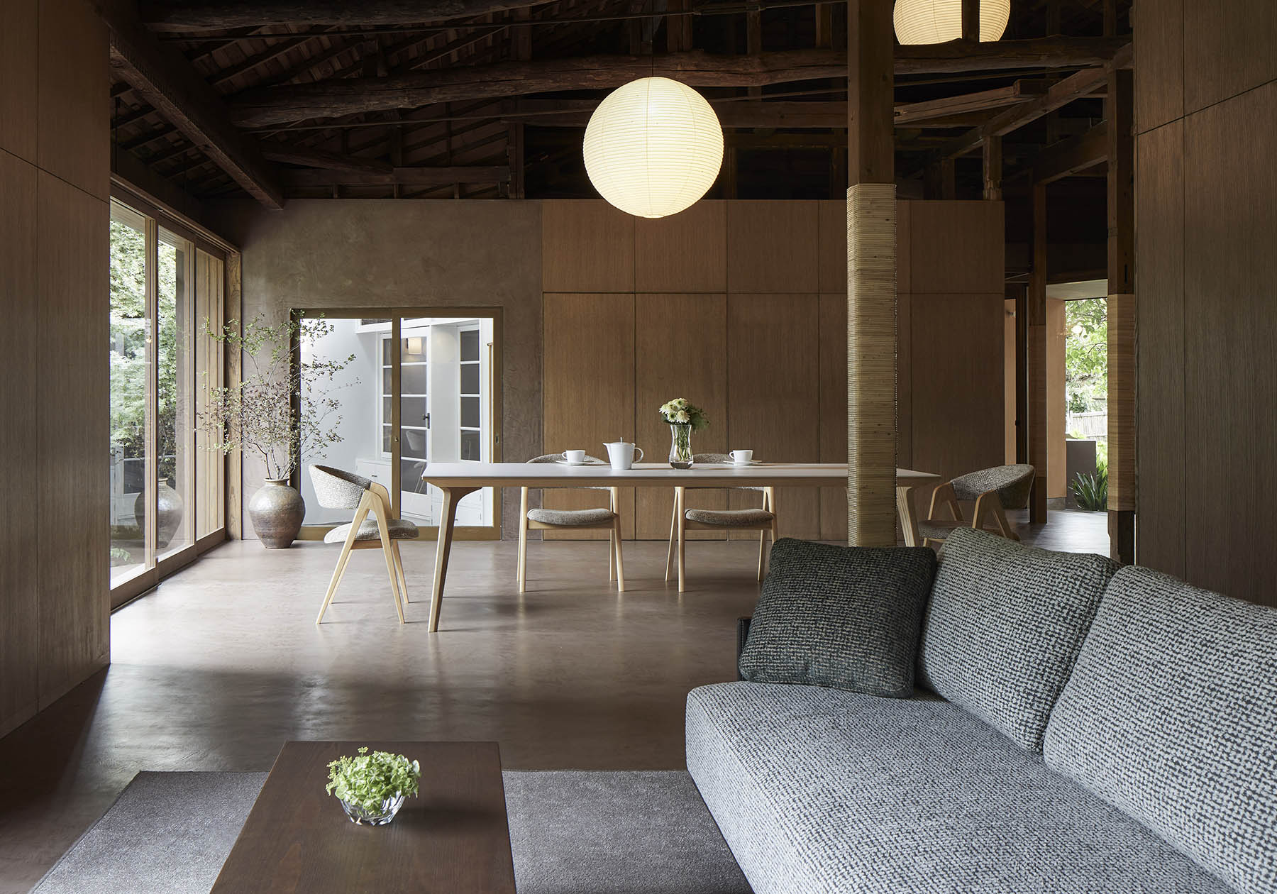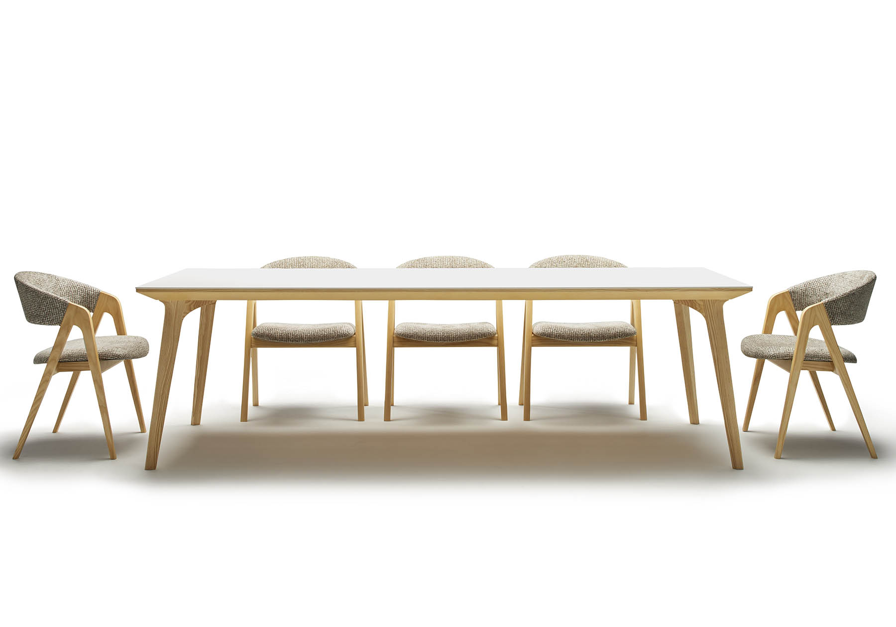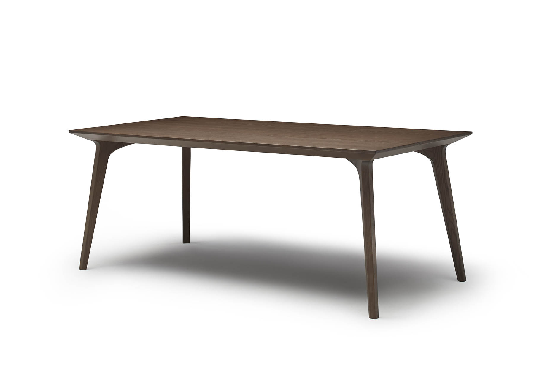 1950年代のアメリカで花開いた北欧モダンデザインのヴィンテージ家具を意識したデザインで、ホワイトアッシュ材を削り出した脚は、流れるようなラインで天板を柔らかく支えます。柔らかでシンプルなデザインは人が集うダイニングシーンからオフィスのデスクとしてもお使いいただけます。