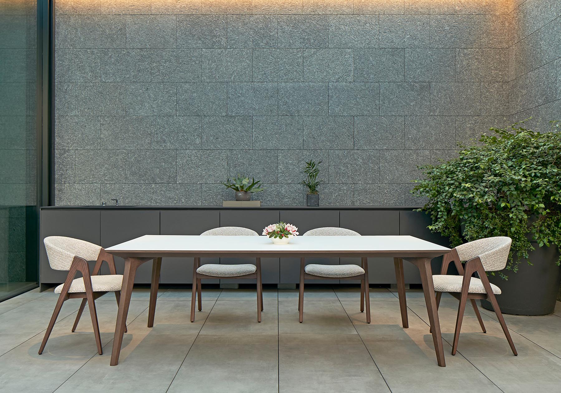 天板の種類は50ミリのホワイトアッシュ突板の天板のWtypeと、6ミリの人工大理石、バイオマーブルをトップに使用したMtypeがお選びいただけます。ホワイトアッシュ突板はナチュラル感を大切にした板杢を使用しバイオマーブルは植物由来の原材料を50%以上使用した素材で環境に配慮した素材というだけでなく、6ミリのメラミン樹脂素材により堅牢で、傷が付きにくく、永く使える素材です。 それを支えるホワイトアッシュ無垢材の脚部は天板から流れるようなシルエットで、外斜め後方に天板を持ち上げます。テーブル脚部を固定する方法も独自の新設計で通常使われるダイキャストの固定金具を使わず、特殊な技法でホワイトアッシュ無垢材をボルトで直接固定しており、強度を高めただけでなく、必要な金具を最小限に留めた、環境に配慮した構造になっています。