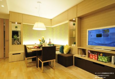 子供と楽しく過ごす空間とは?というコンセプトのもと、ソファを無くしたアクティブリビング(Wiiで学び、遊び、運動する)、子供の成長に合わせた可変性のあるファミリーベッドルーム、見守り学習のスタディダイニング、キッチン横のパパデスク、プラスαとしてのママルームなど、マンション空間の新しい使い方モデルとして空間構成しました。