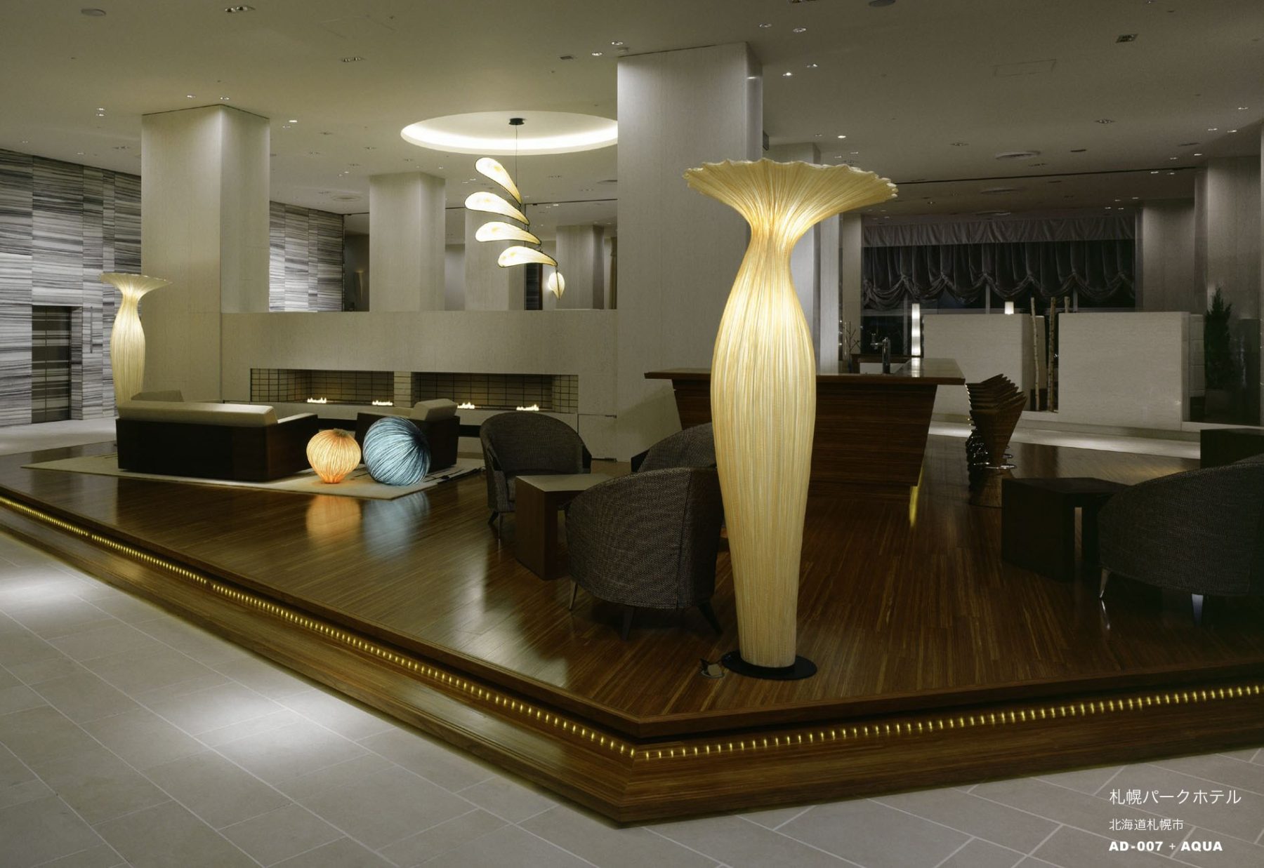 得ているホテル。北海道、札幌中島パークという立地を行かしたシティリゾートをコンセプトに、全国、世界にアピールしたいとの意気でリノベーションが実施されました。照明と、家具の調和が実現しました。