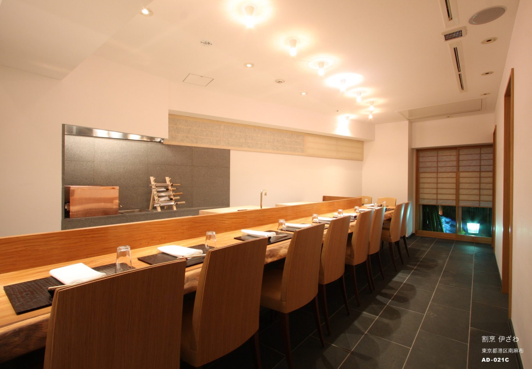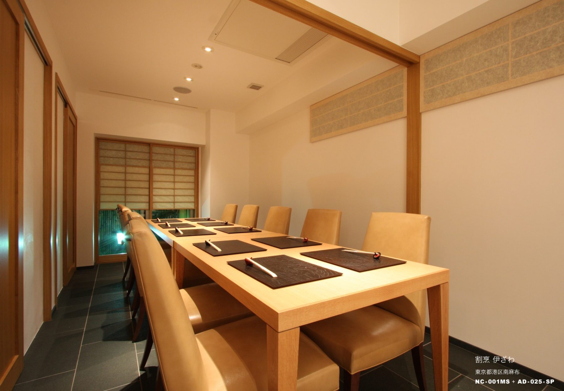 オーナーである伊澤さんの料理と同様、石・木・しっくい・ 紙ー素材を活かした空間づくり。モダンでおしゃれになりす ぎない、でも、上品で落ち着きのあるゆったりとした時間。 ベージュの革は空間に自然に溶け込み、さりげなく柔らかく お客様を迎えます。