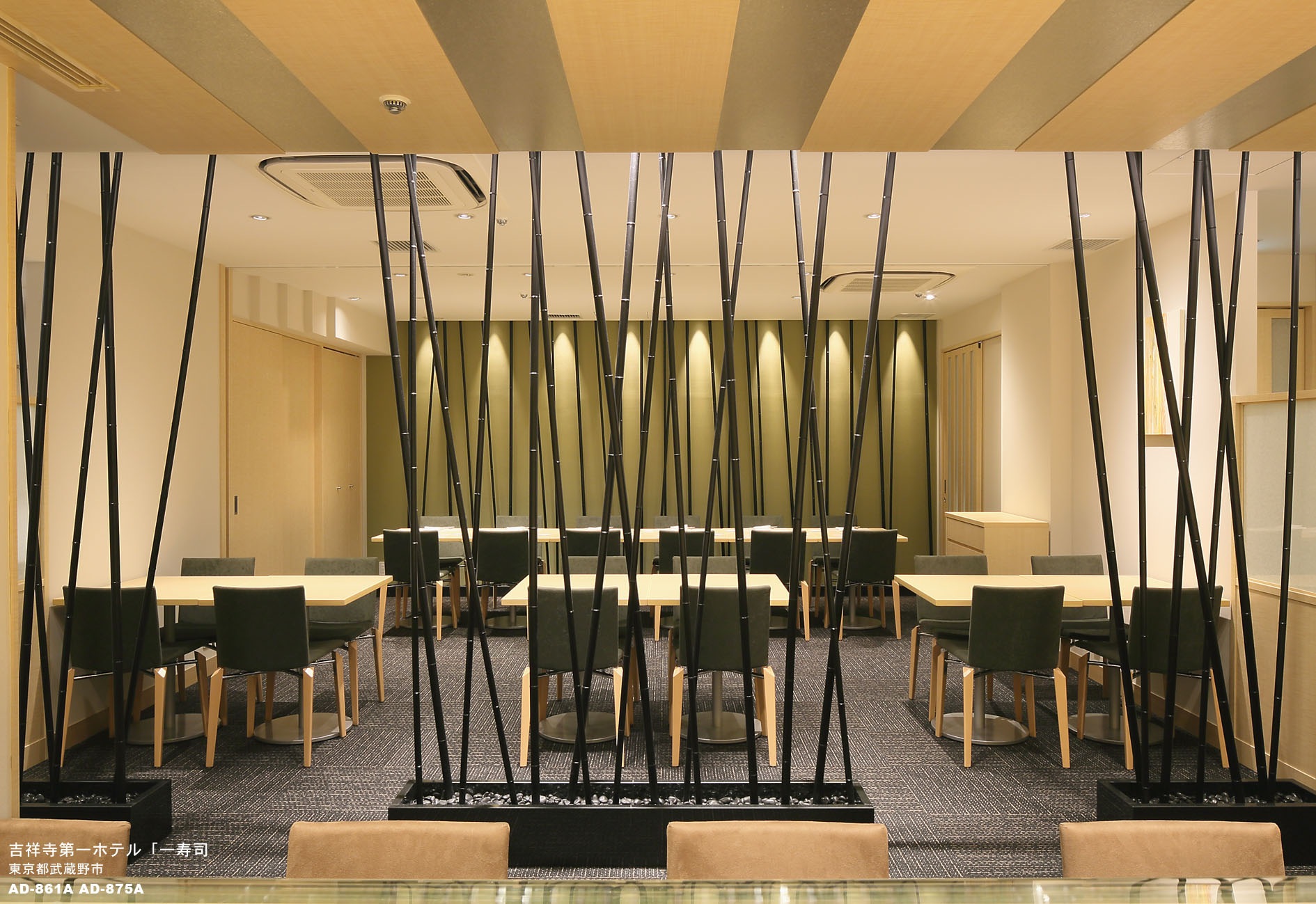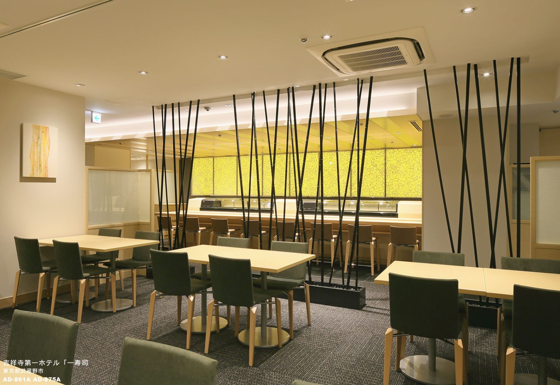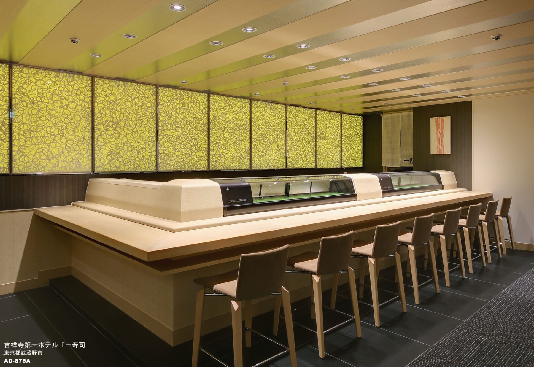 「一寿司」が、中庭の竹林エリアにあることを前提にして、内装のアクセントに竹を使用しています。寿司カウンターは、ステージと 考え、舞台上の寿司職人のエンターテイメント性を表現。