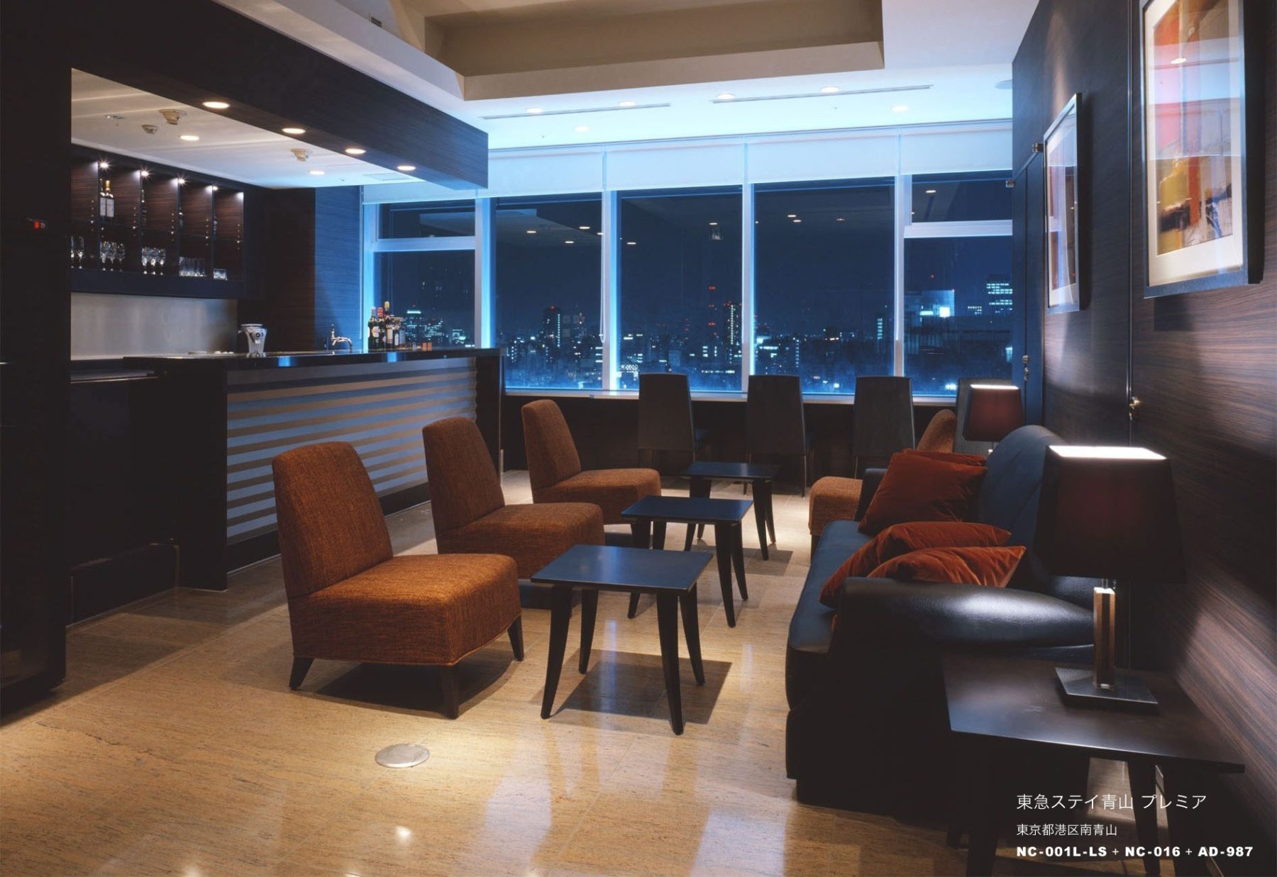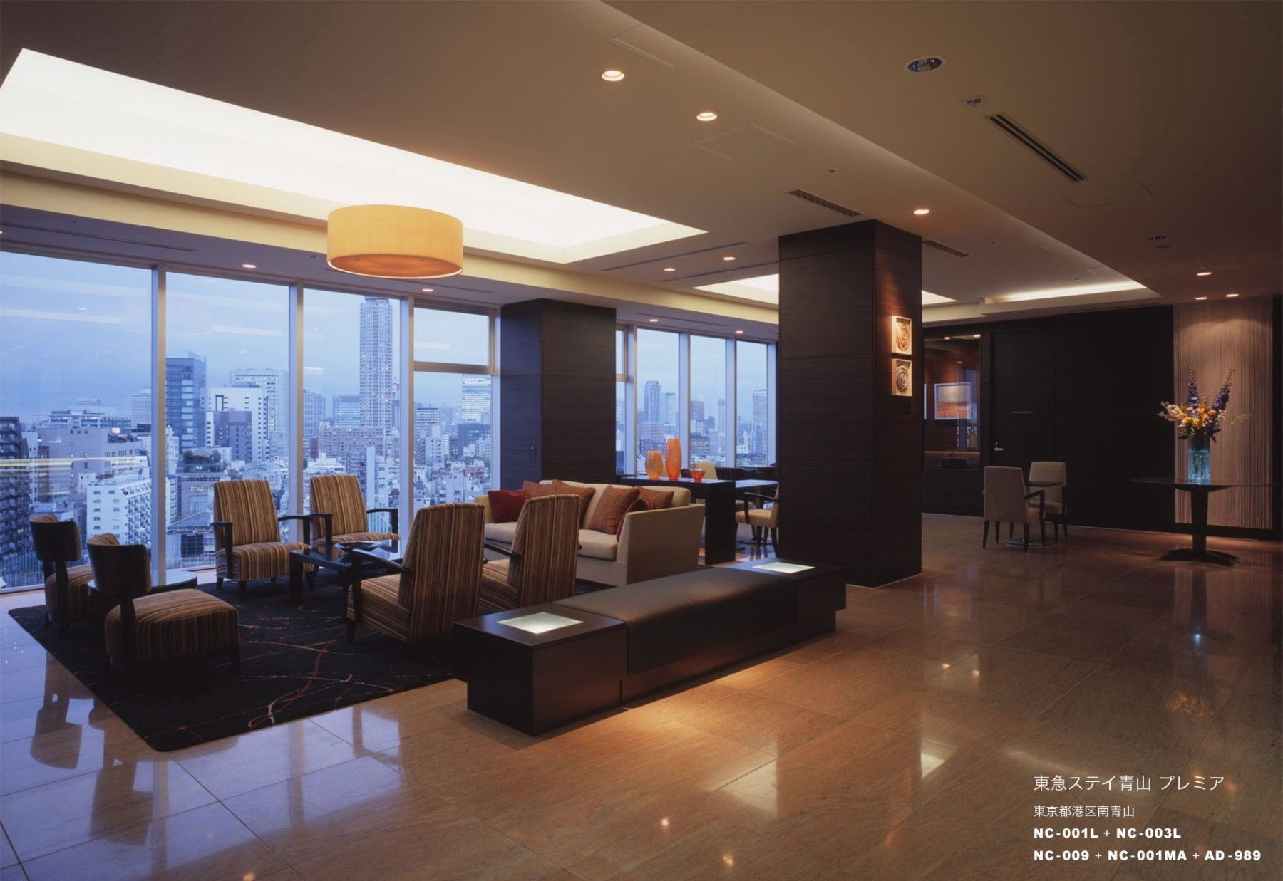 青山外苑前の好立地に建つ25階建ての タワーホテル。客室数170室の宿泊主 体型で長期滞在する海外からのゲスト も多く、和のデザインエッセンスを隠 し味にシンプルでモダンなテイストに まとめました。メインロビーはタワー 中間階に設け、ナチュラルなカラース キームの落ち着いた空間にアートワー クやペンダントライトをアクセントとし、上質な家具をゆったり配した寛げるロビーラウンジに。眺望と夜景は素晴らしく、遠くに東京タワーや新宿の高層ビル群を眺める事が出来ます。