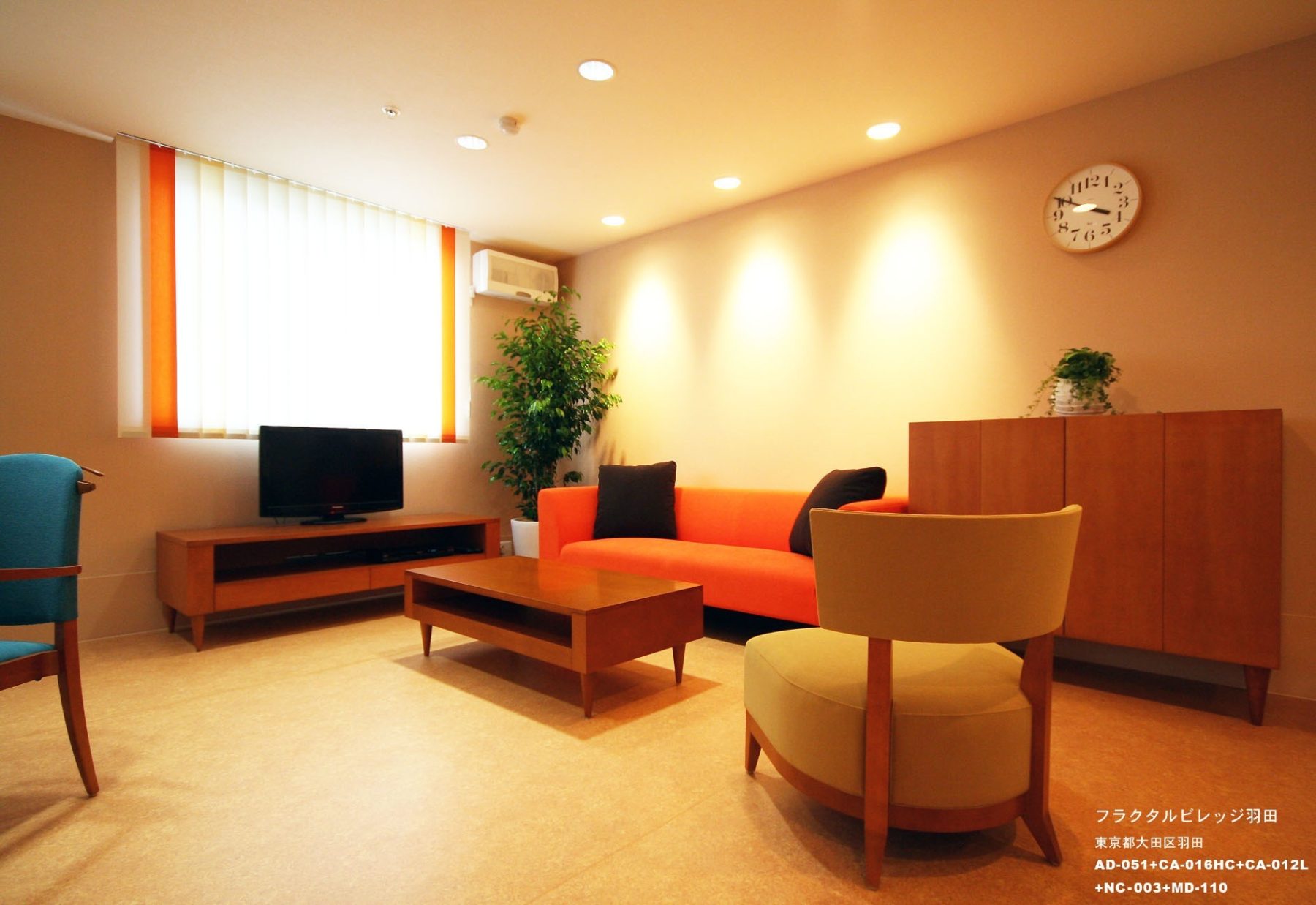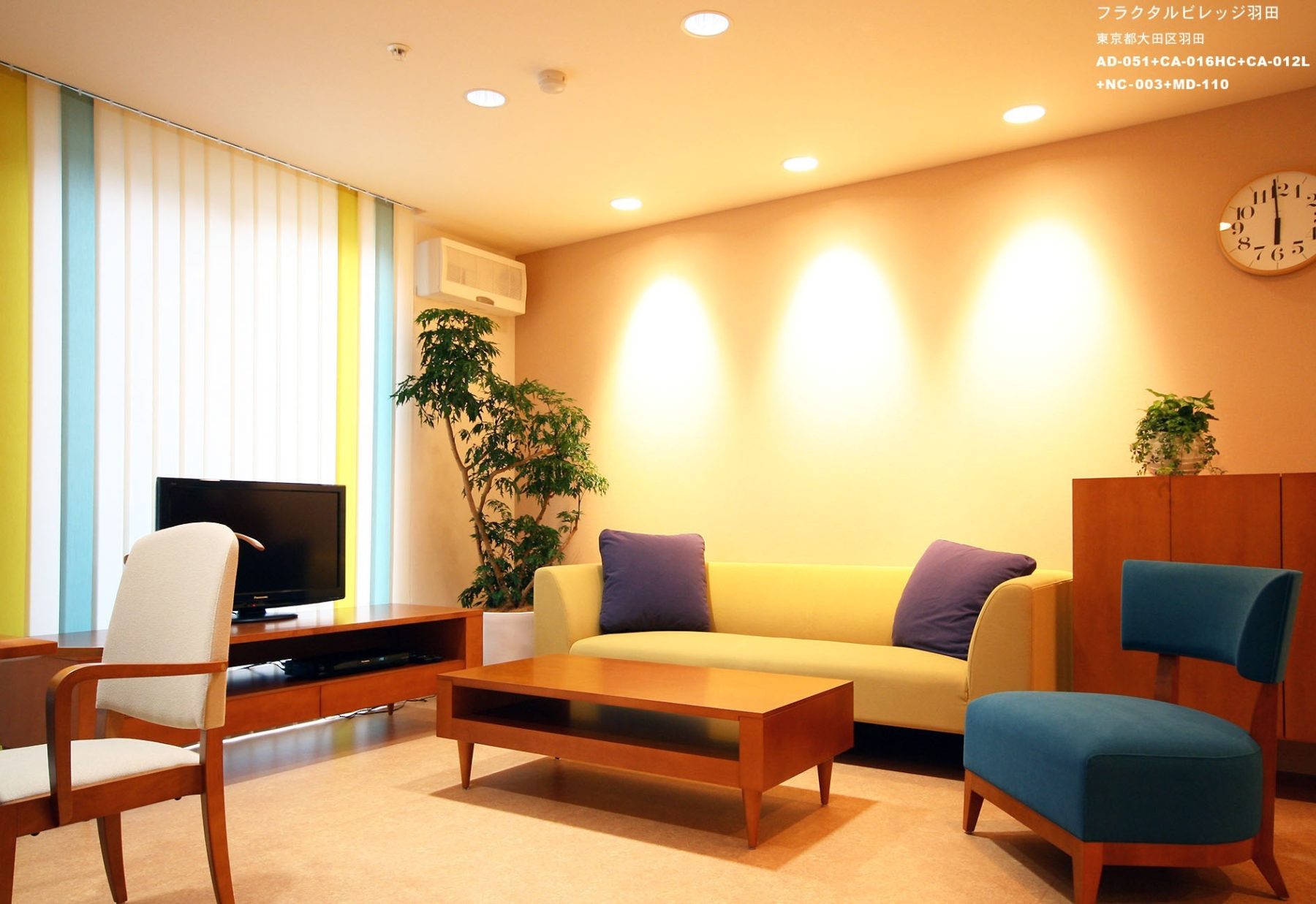 利用者の方、そのご家族にとって安心できる、第二の我が家としてのインテリアを目指し、家庭的な暖かさを随所に盛り込むデザインとしました。 機能的であることはもちろんですが、その上で「暮らしの楽しさ」を感じて頂くことを意識し、各アイテムをセレク ト、デザインしました。 各階のリビング&ダイニングは、AD CORE:エーディコアの家具でトータルコーディネート。張地色の組み合わせに より、各階様々なイメージの空間が出来ました。ジャケットハンガーやステッキホルダーの機能性を持ちながら、ス マートなデザインのチェア「ADESSO」(アデッソ)は、デザイン性を意識した、今までにない福祉空間の中で、欠かせない存在となっています。