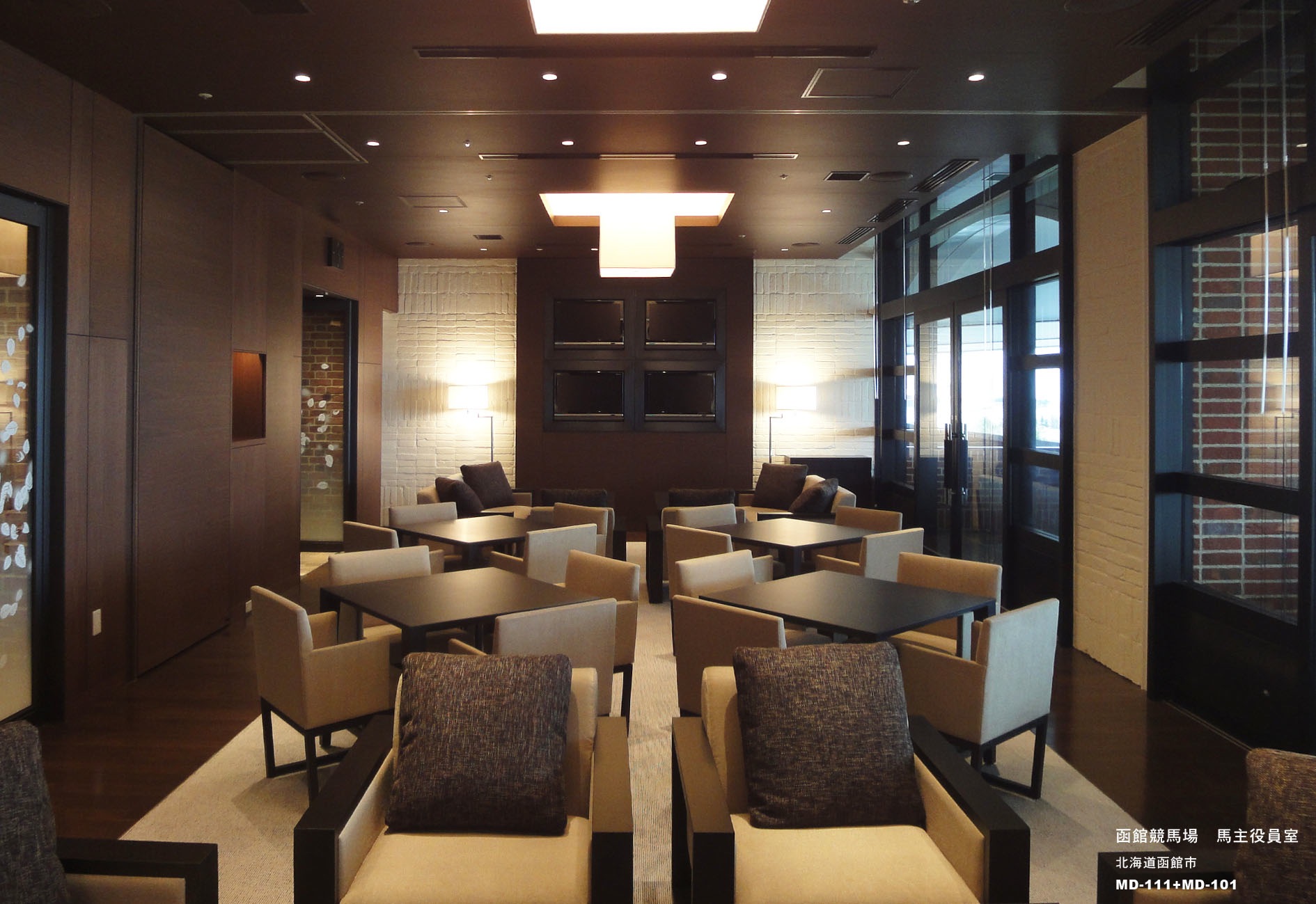 この馬主役員室は、建物全体のデザインコンセプトの構成要素のひとつである「対極にある素材・色及びデザインの組み合わせによる相乗効果」を念頭に置いて デザインされ、そのシックで落ち着いた雰囲気で仕上げられたインテリアは、窓の風景を借景することで完成されています。