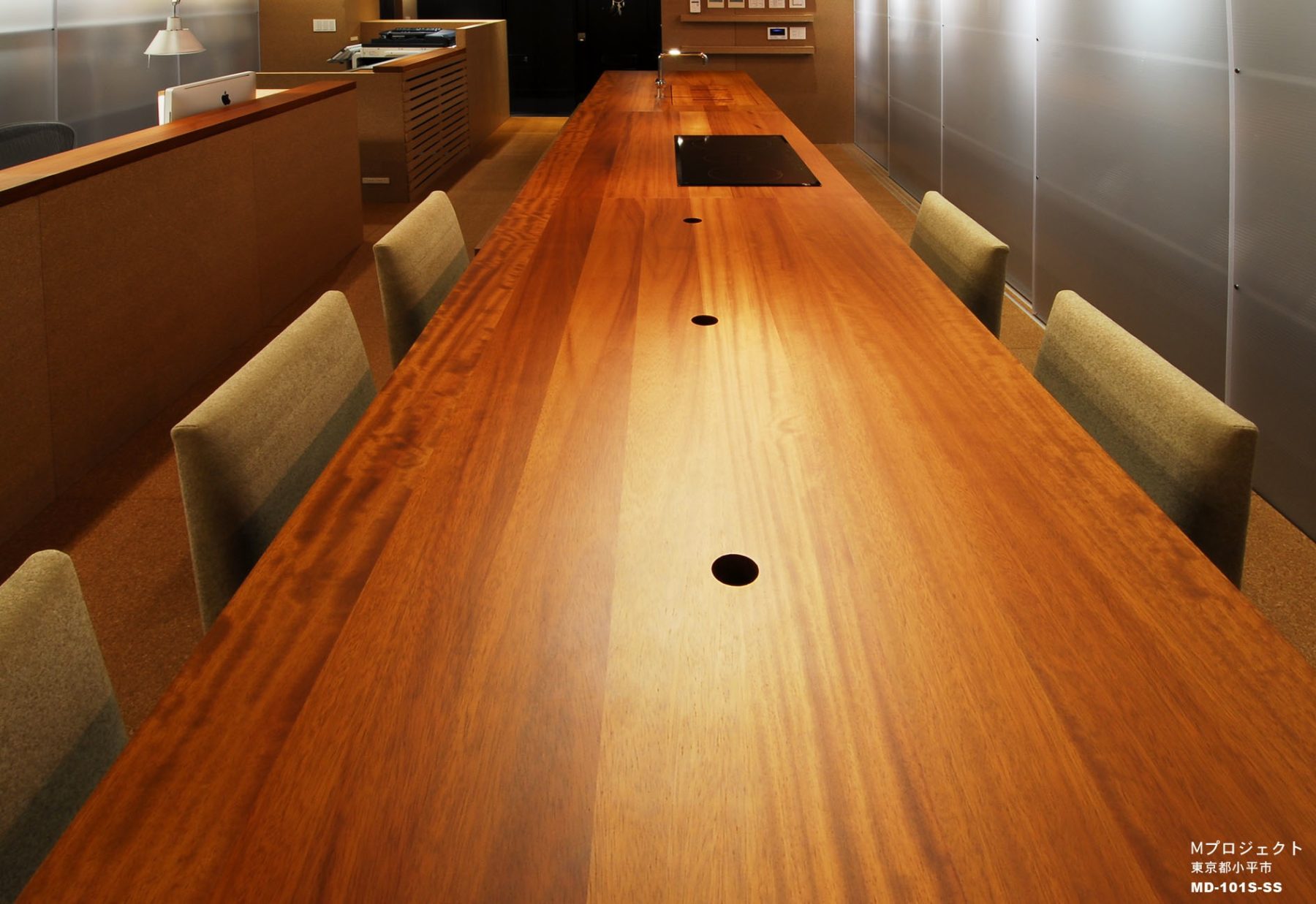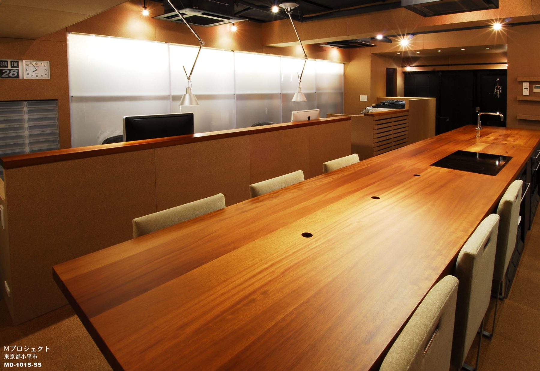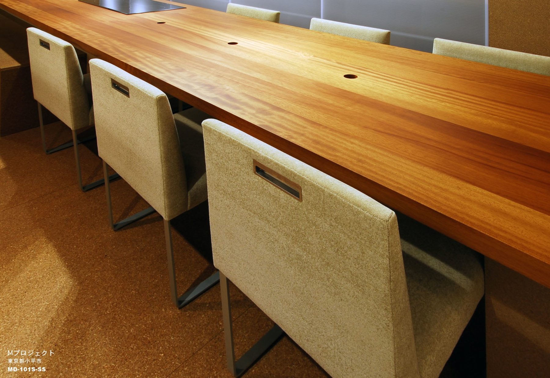 椅子として採用したA-modeの製品は、ふっくらとした背座にシャープなスチール脚のコンビネーションのデザインが秀逸で、ムクの天板との相性も抜群でした。