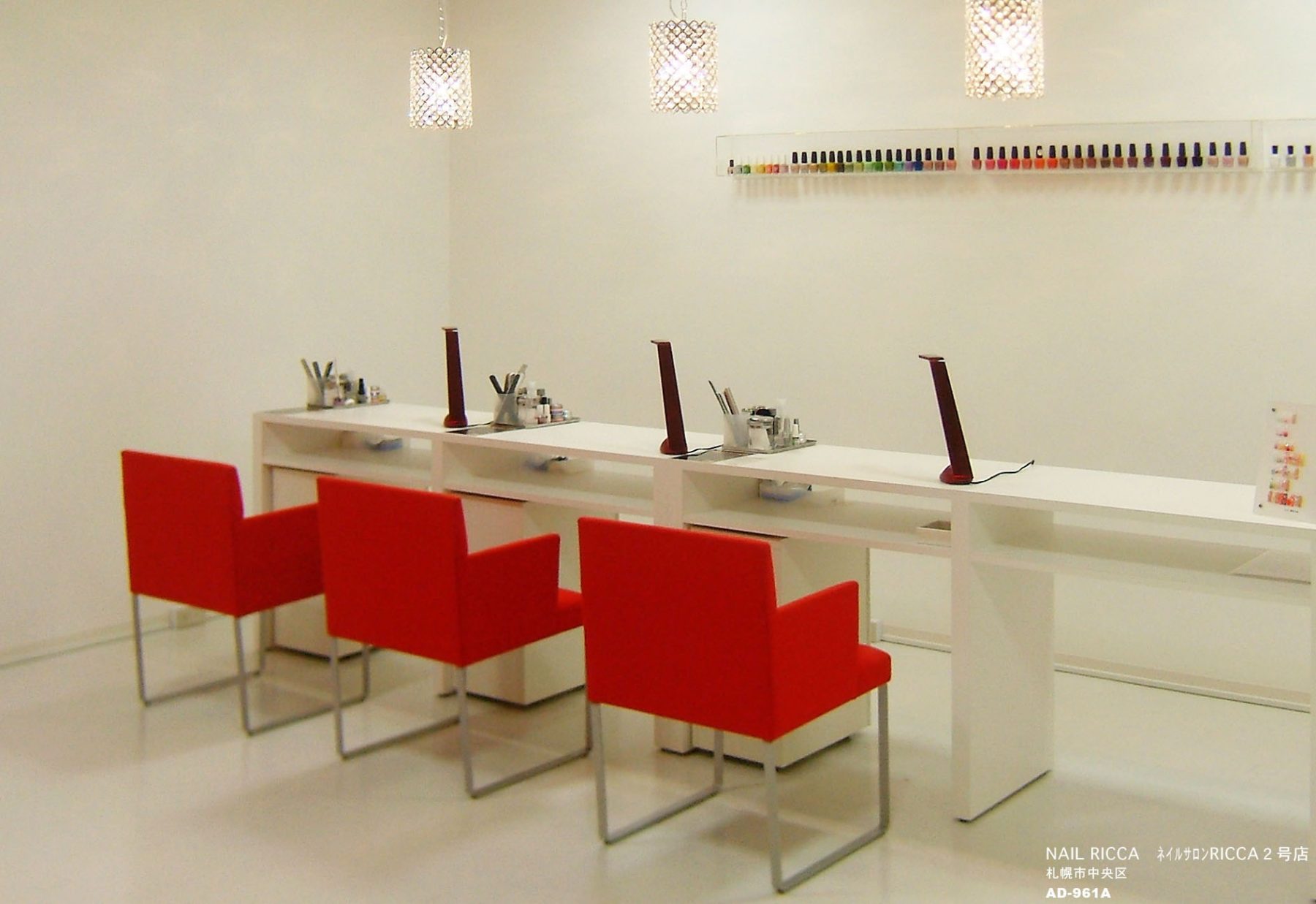 今回は、新札幌アークシティdUO-21号店に続きIKEUCHI ZONEビル5Fに2号店をオープンすることになりました。 内装をシンプルホワイトで統一された中に、赤をポイントにして、リッチな華やかさと楽しさを演出しました。 椅子のシンプルさと張り地の赤が、とてもマッチして、デザインコンセプトにぴったりでした。