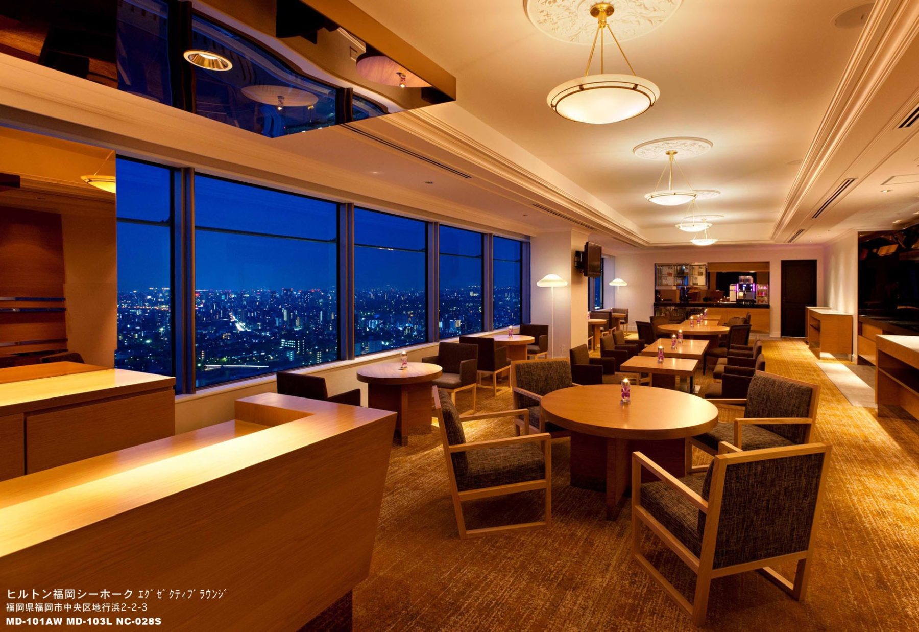 2012年にオープンした33階「エグゼクティブラウンジ」は、エグゼクティブフロアにご滞在のお客様のための専用ラウンジ。高さ120mからの景観(SPACES)は、博多湾と市街が一望でき、市内ではヒルトン福岡シーホークでしか味わえない絶景のロケーションです。