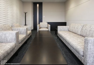 家具については、『包まれる感のある椅子』を求め、ハコ型で安心感のあるシルエットのものを採用。 レザーではなく、敢えて織り柄の綺麗なファブリックを用いる事で、フォーマルな話題の中に、インフォーマルな コミュニケーションも生み出せる様な設えにしました。
