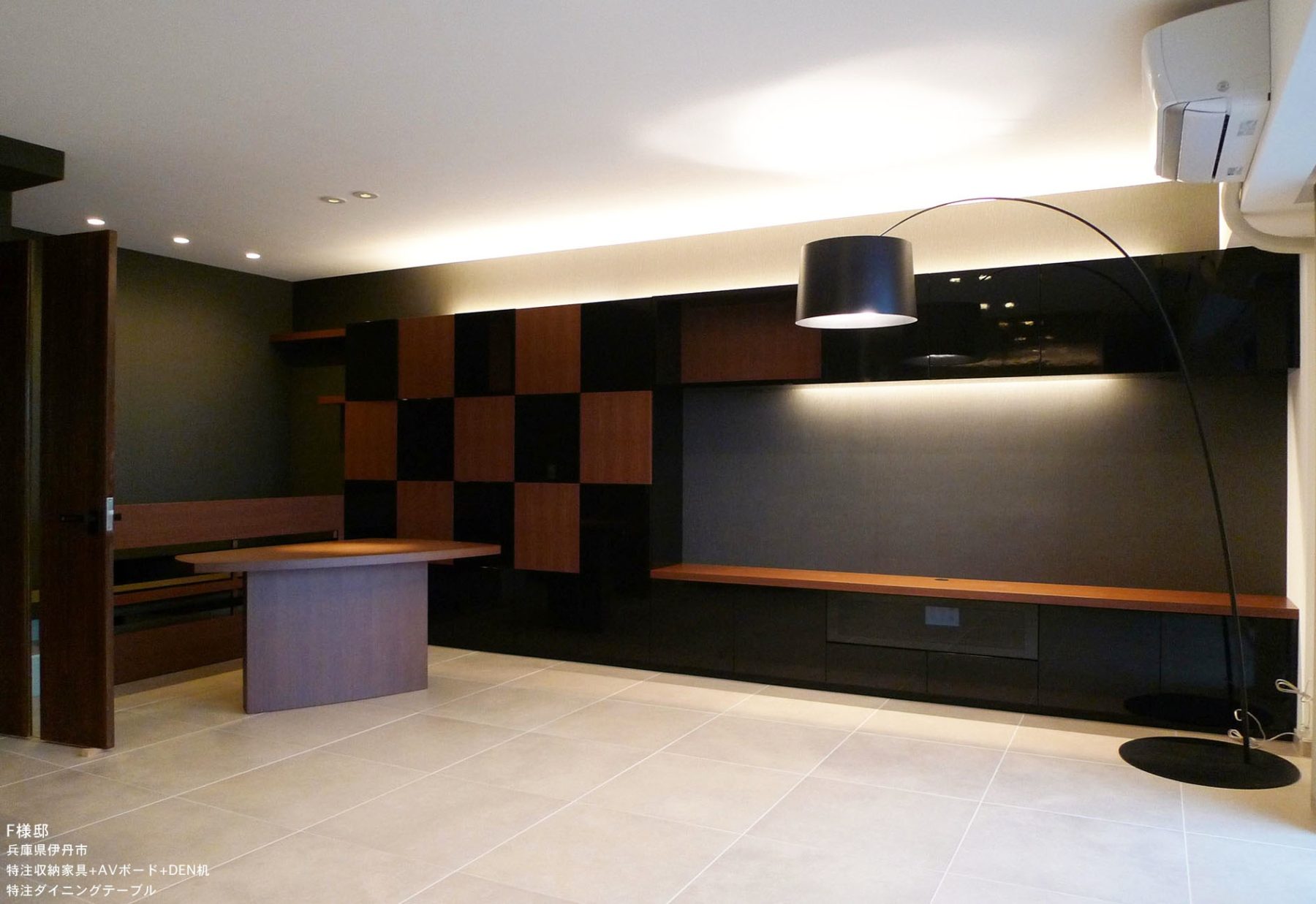 デザイン性とクオリティも大切ですが、生活空間には実用性も重要。 リビングの造作家具は、ご家族が実際にご使用になるモノに合わせたサイズで、 使い勝手にもこだわって、特注しました。 LED間接照明や、ウォールナットと鏡面ブラックの面材は、 オープンキッチンとの一体感、バランスも考慮しています。 オリジナル造作家具で、 実用性もありながら、印象的なインテリア空間が完成しました。