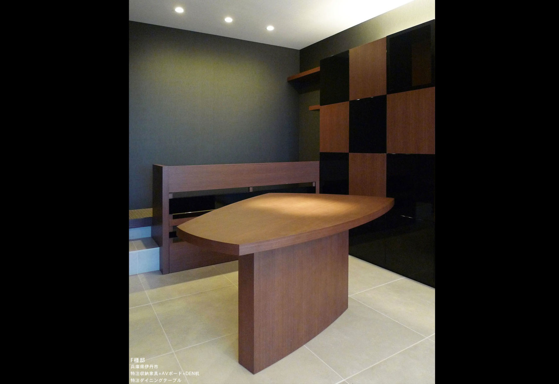 LDKに隣接したコーナー和室を、リビングに取り込むことで生まれた、長い壁面を活かす造作家具、 特注のダイニングテーブル等をオーダーさせて頂きました。