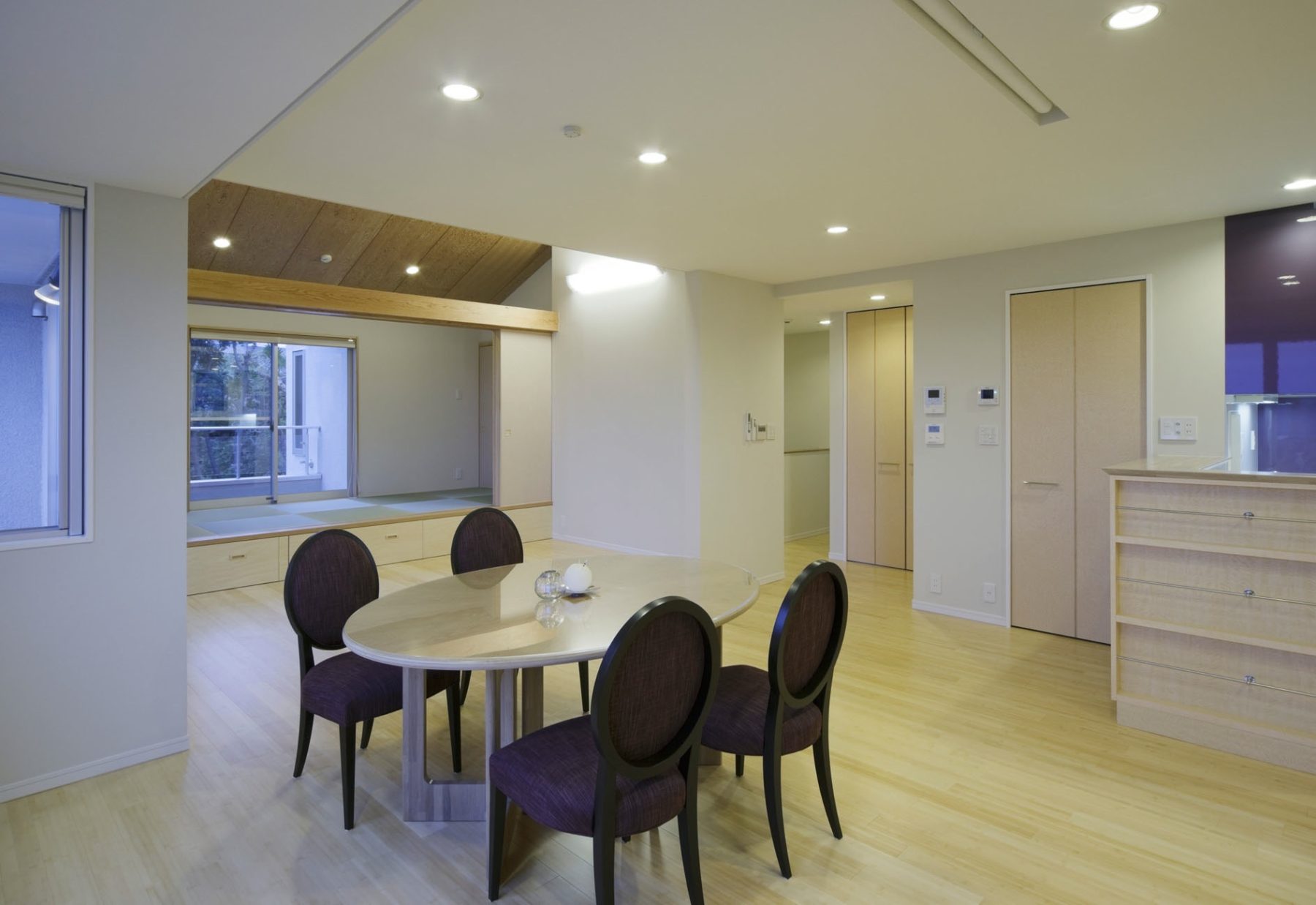 キッチンの面材にも使用している、奥様お好みの”パープル”をダイニングチェアのファブリックにも使い、淡い木目のテーブルと コーディネートしました。