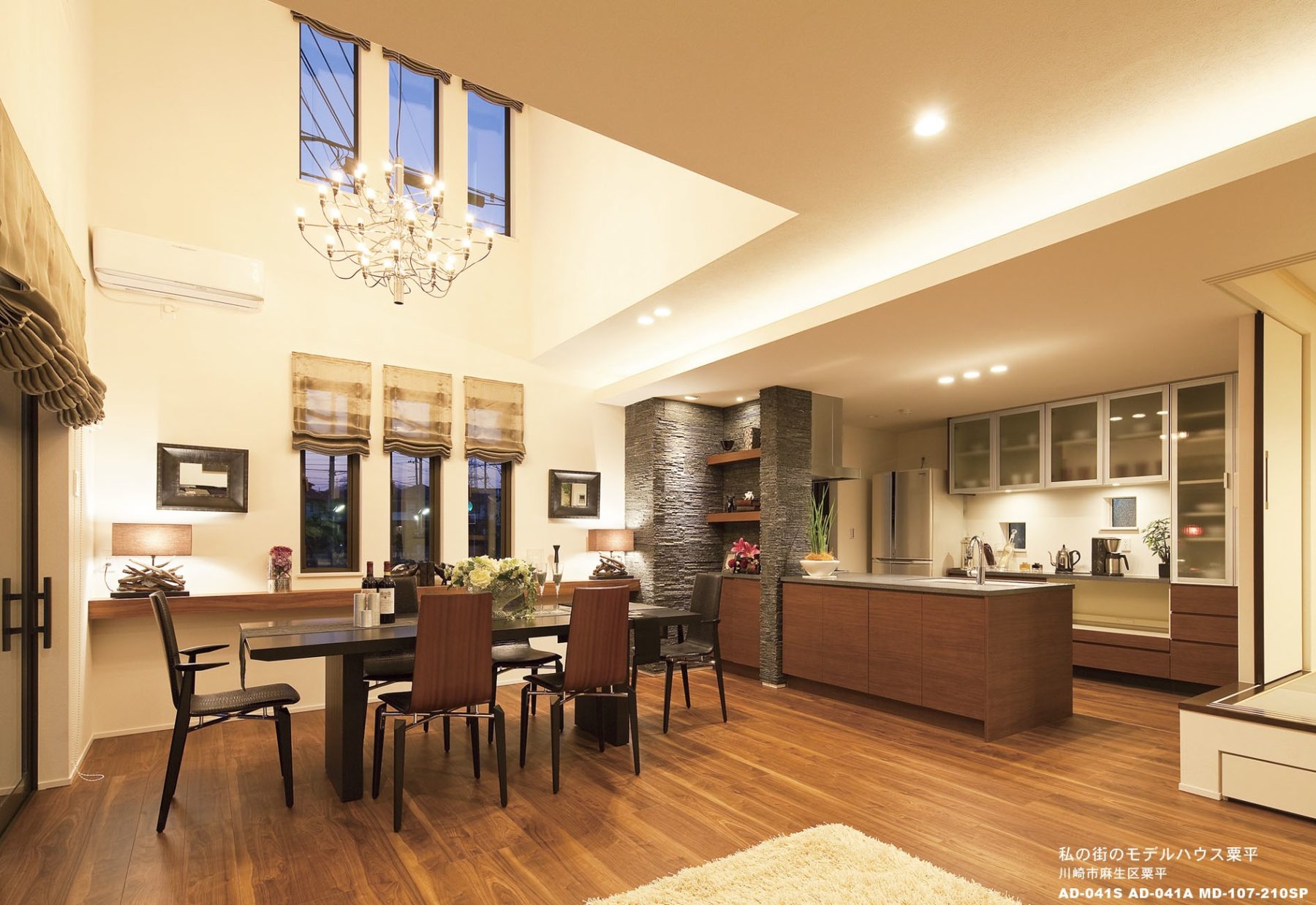 標準的な仕様を基に、インテリアと内装デザインでワンランク上の空間を提案し、SE構造ならではの大空間を自然石の重厚感と 無垢の家具で五感に響く上質感を演出しました。