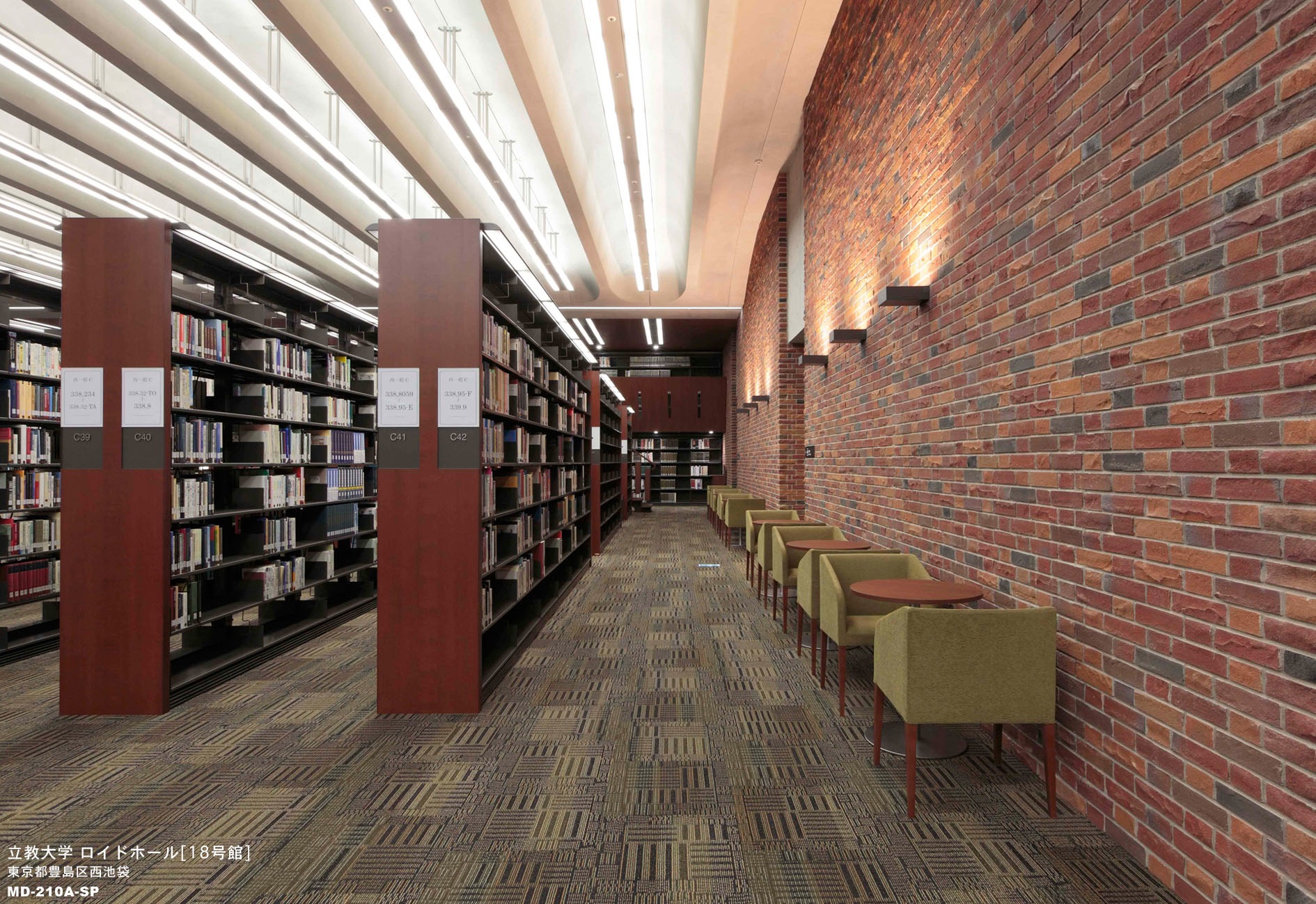 エーディコアの商品は図書館地下1階展示コーナーのラウンジ、各階の立教大学の伝統ある煉瓦壁周辺のラウンジに採用し、張地カラーをフロアー毎に変えて、華やかさと落着きのある空間を演出しました。