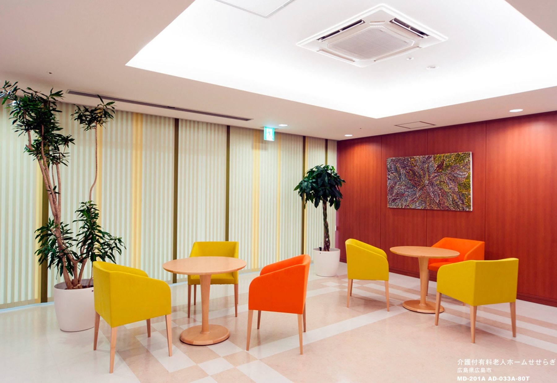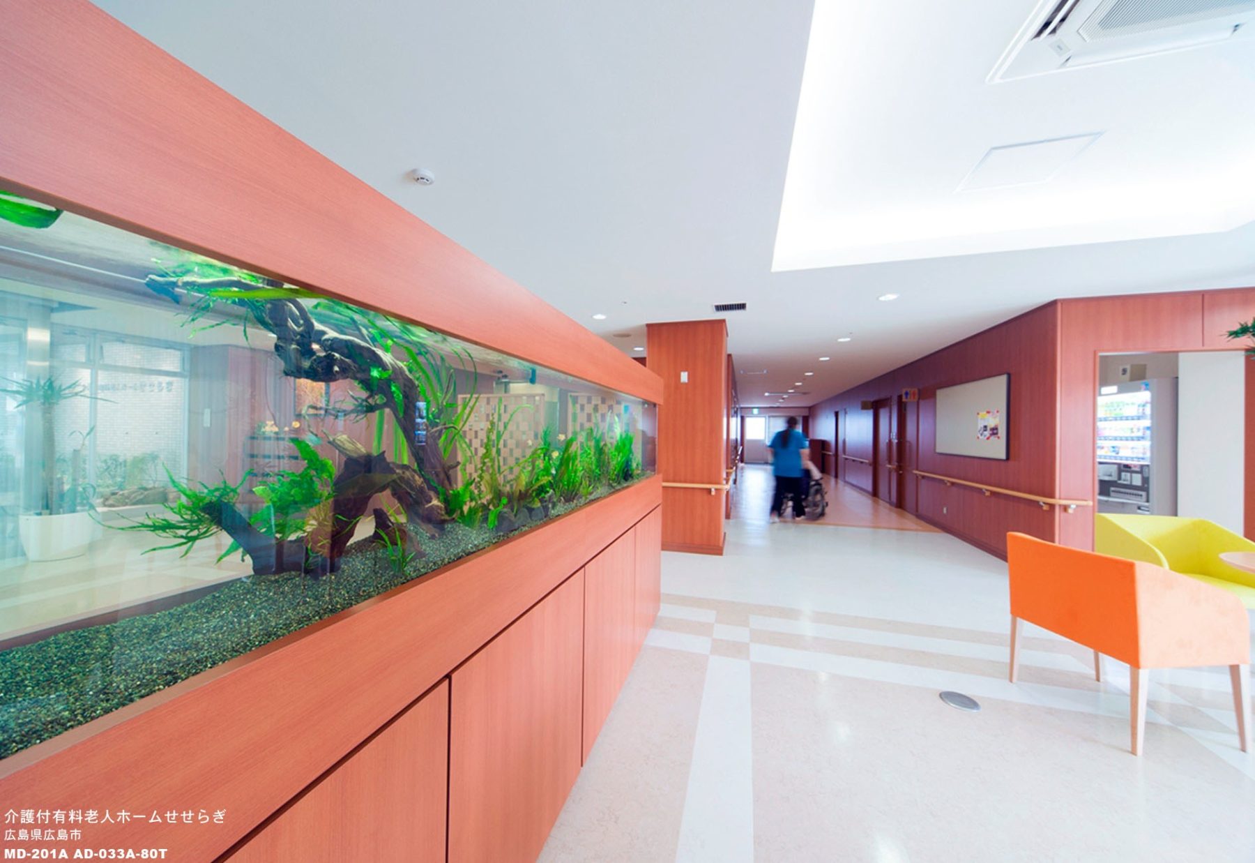 レストコーナーには、癒し効果抜群の水槽を配置。チェアの張り地も元気の湧く色合いでコーディネートし、明るく華やかな空間となりました。