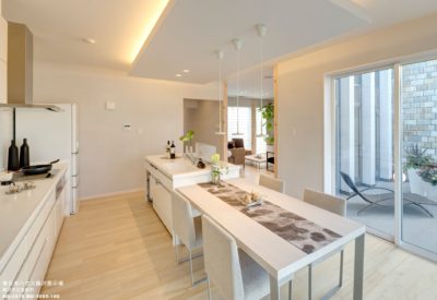 ダイニングは、白を基調にしたキッチンに合わせたモダン空間にしました。