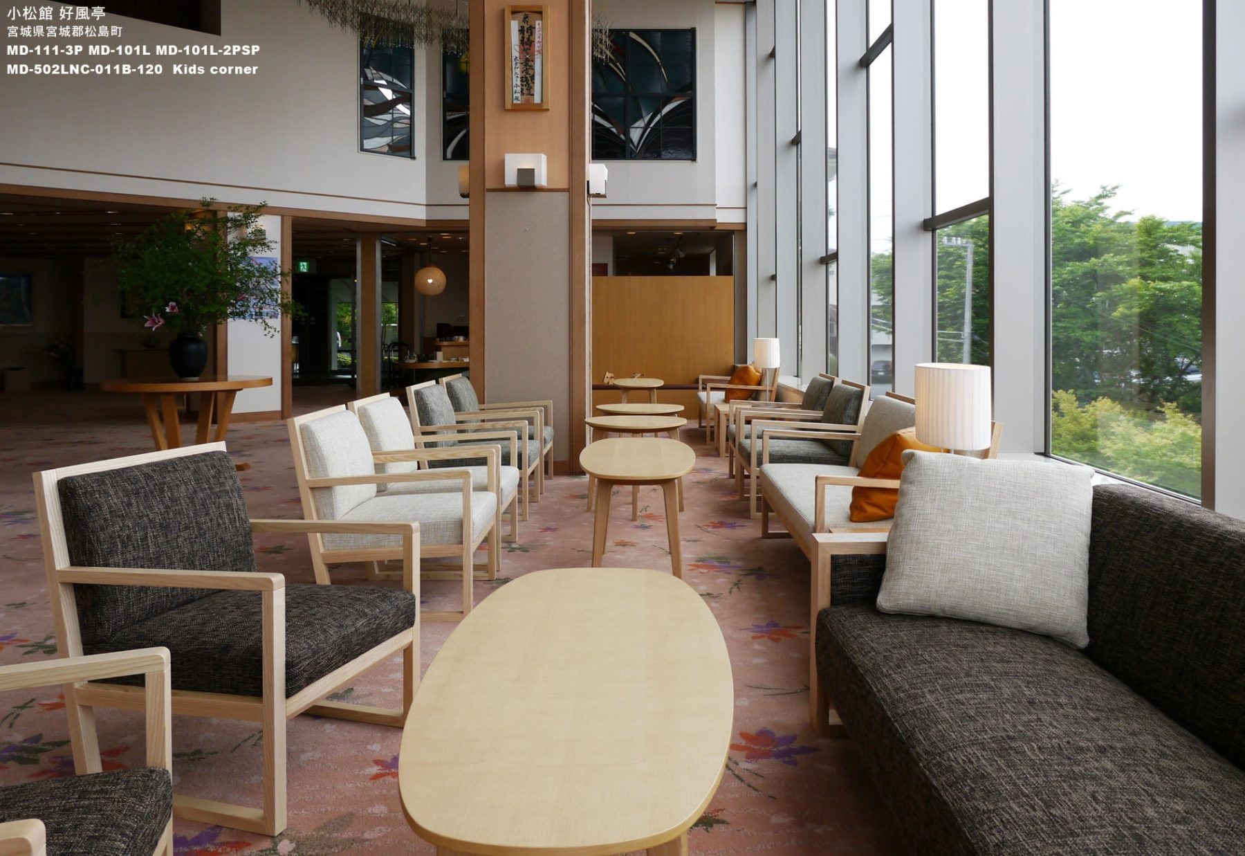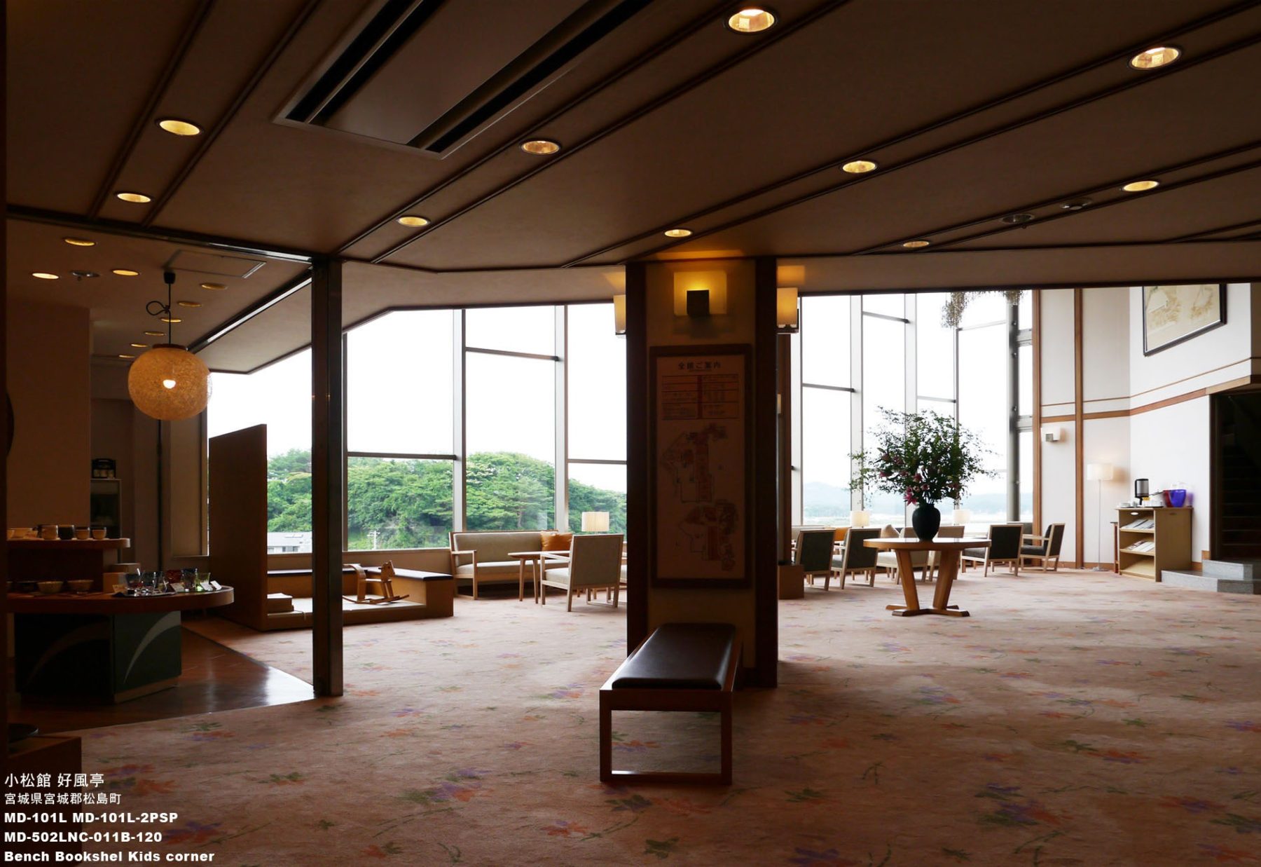東日本大震災では津波の被害こそ免れましたが、地震動により吹抜けロビーのガラス破損や、客室に被害を受けました。震災後半年後に内外装の修繕とリニューアルを経て営業を再開しました。エーディコア・ディバイズでは被害のあったロビーと、古くなったラウンジの家具のリニューアルをオーナー様よりご依頼いただき、家具プランから壁のアート製作、納品までいたしました。