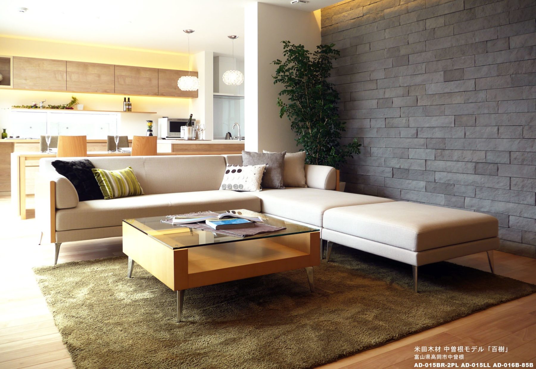 床材に無垢のサクラ、リビング壁には凹凸感のあるタイルを採用し、優しさと上質感を体感できる「ナチュラルモダン」テイストに仕上げました。